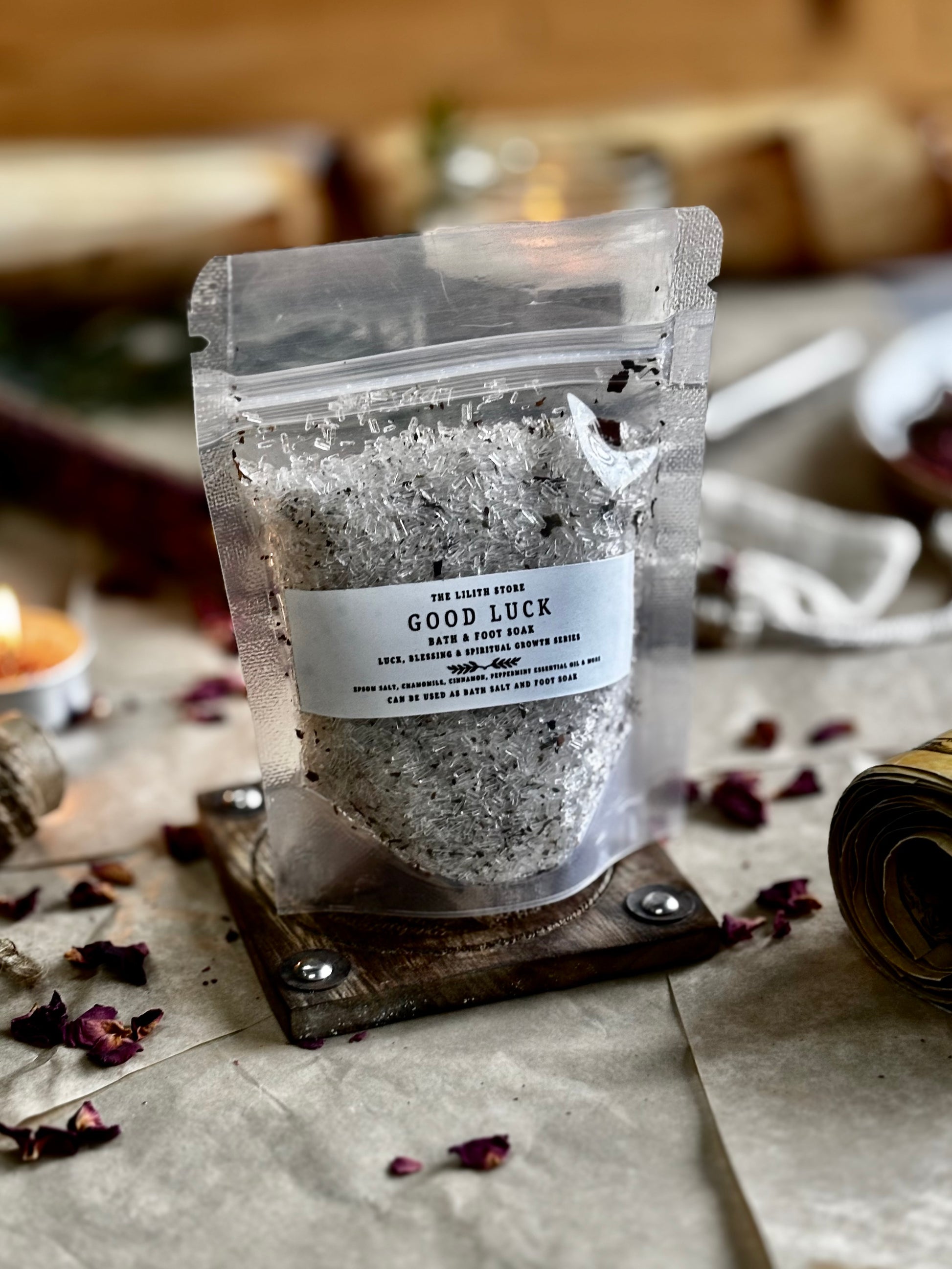 Invite positivity and refreshing energy into your self-care routine with the Good Luck Bath & Foot Soak, a botanical mineral blend made with Epsom salt, chamomile, cinnamon, and peppermint essential oil. Designed for relaxing bath rituals and mindful moments, this soak helps create a soothing atmosphere while encouraging intention setting for luck, blessings, and personal growth.
