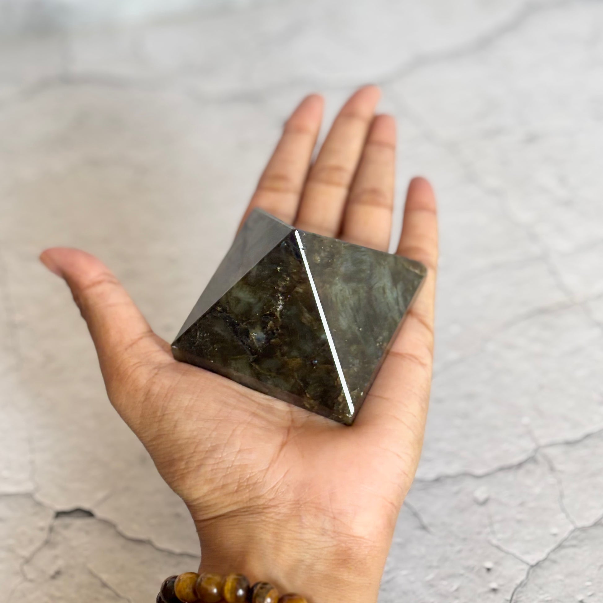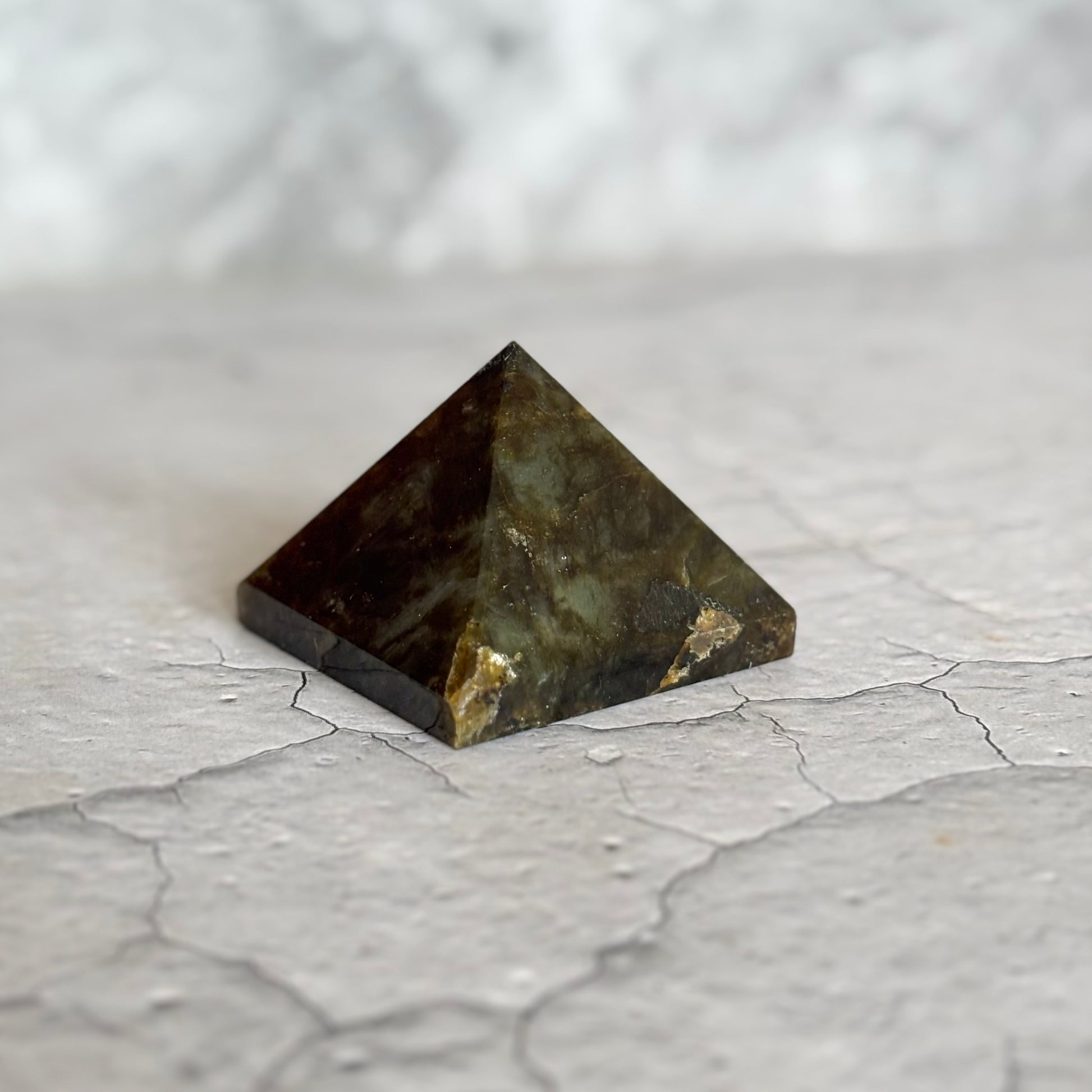 - Genuine Labradorite, hand-carved into a polished pyramid