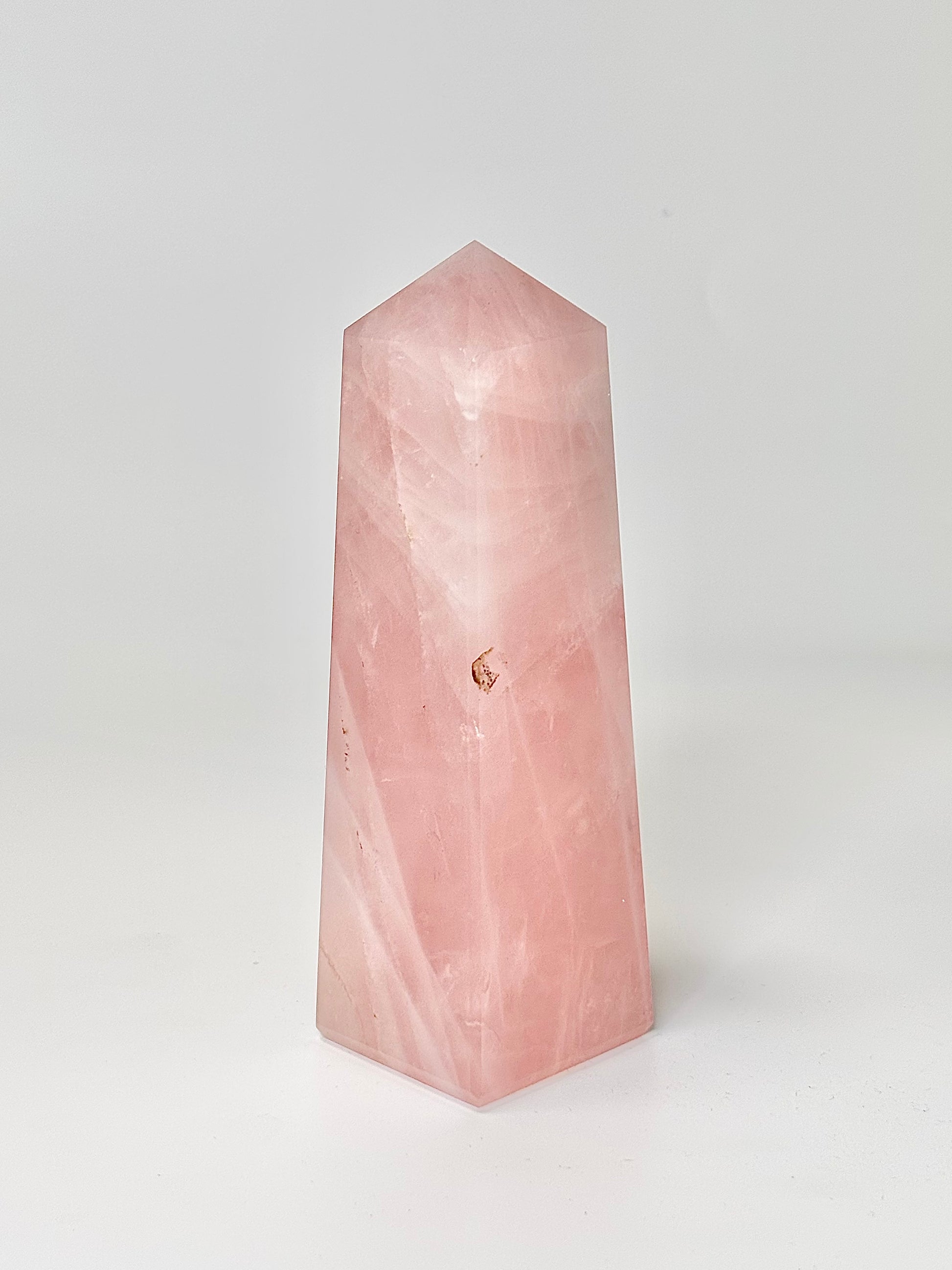The Four Facet Rose Quartz Tower is a polished natural-stone piece with a delicate pink tone and a clean, symmetrical shape. Its four-facet cut gives it a grounded yet refined appearance, making it a versatile accent for a variety of spaces.
