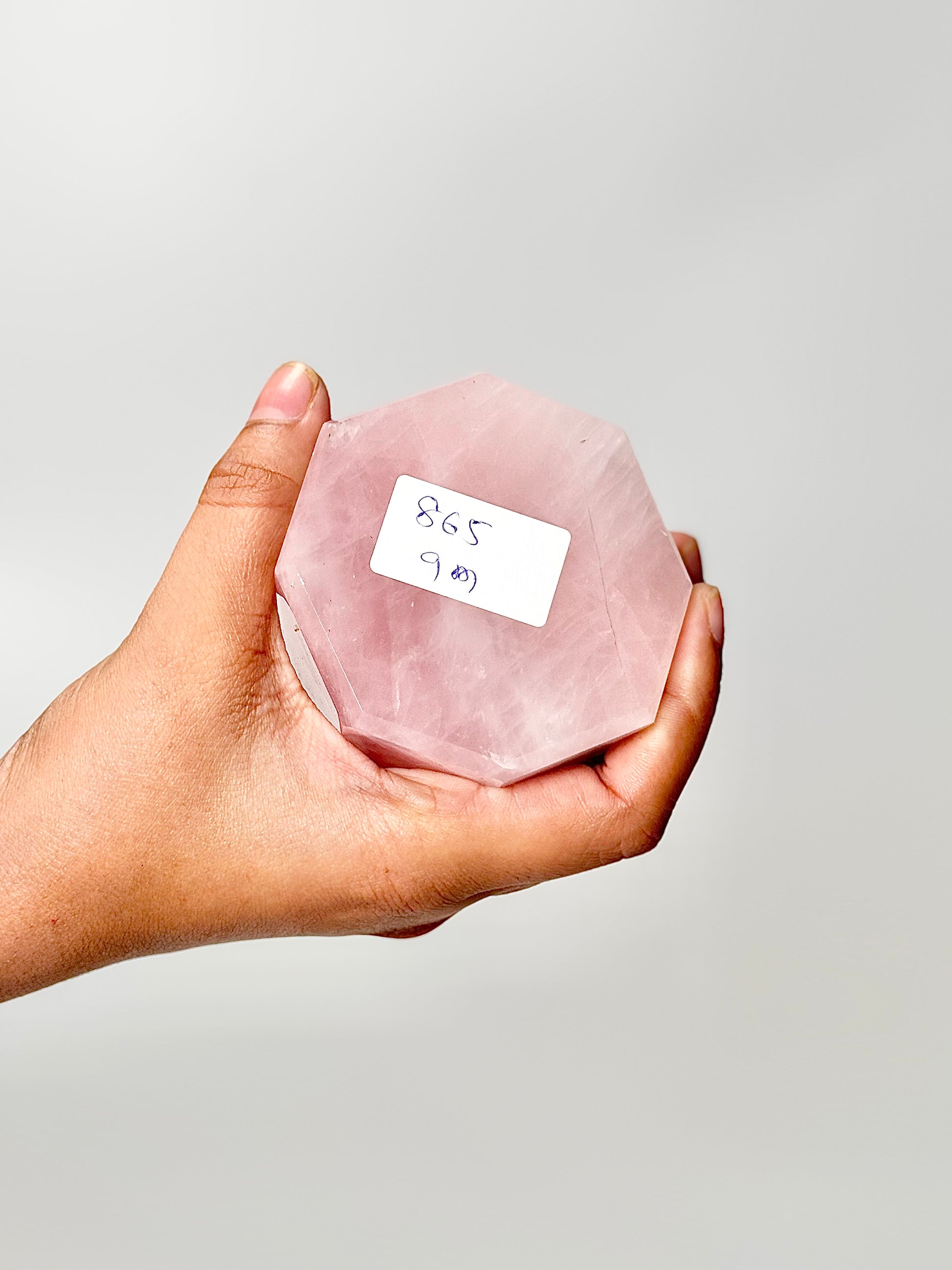 The Eight Facet Rose Quartz Tower is a beautifully polished natural-stone piece, admired for its soft pink hue and graceful symmetry. The eight-facet cut reflects light subtly from every angle, making it an eye-catching addition to any décor style.