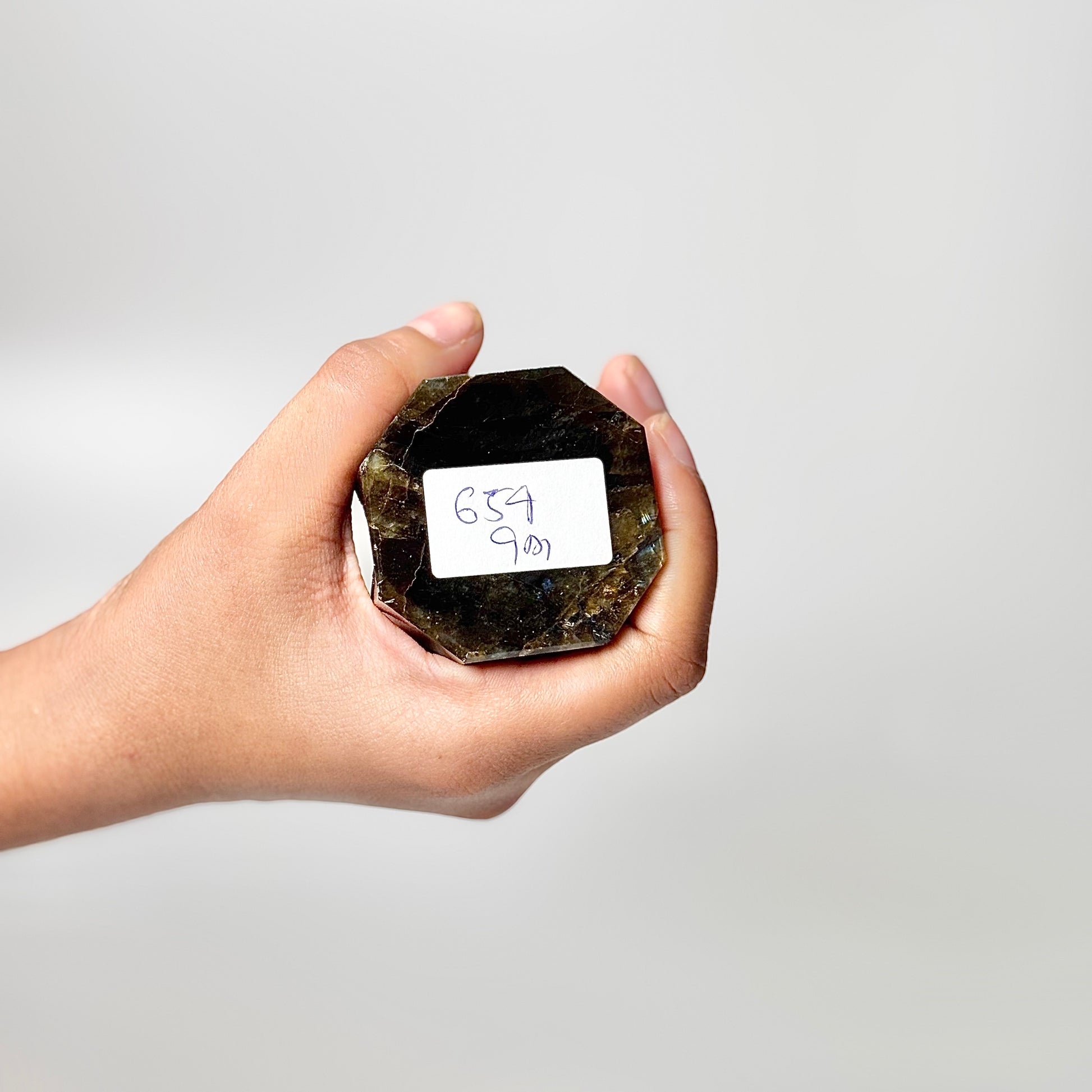 The Eight Facet Labradorite Tower is a captivating natural-stone piece, displaying flashes of blue, green, and gold across its polished surface. The eight-facet cut symbolises balance and multidirectional flow, enhancing both its visual appeal and its presence in a space. Labradorite is valued for inspiring creativity, encouraging self-discovery, and supporting a balanced state of mind, while its shifting colours serve as a reminder of adaptability and transformation.