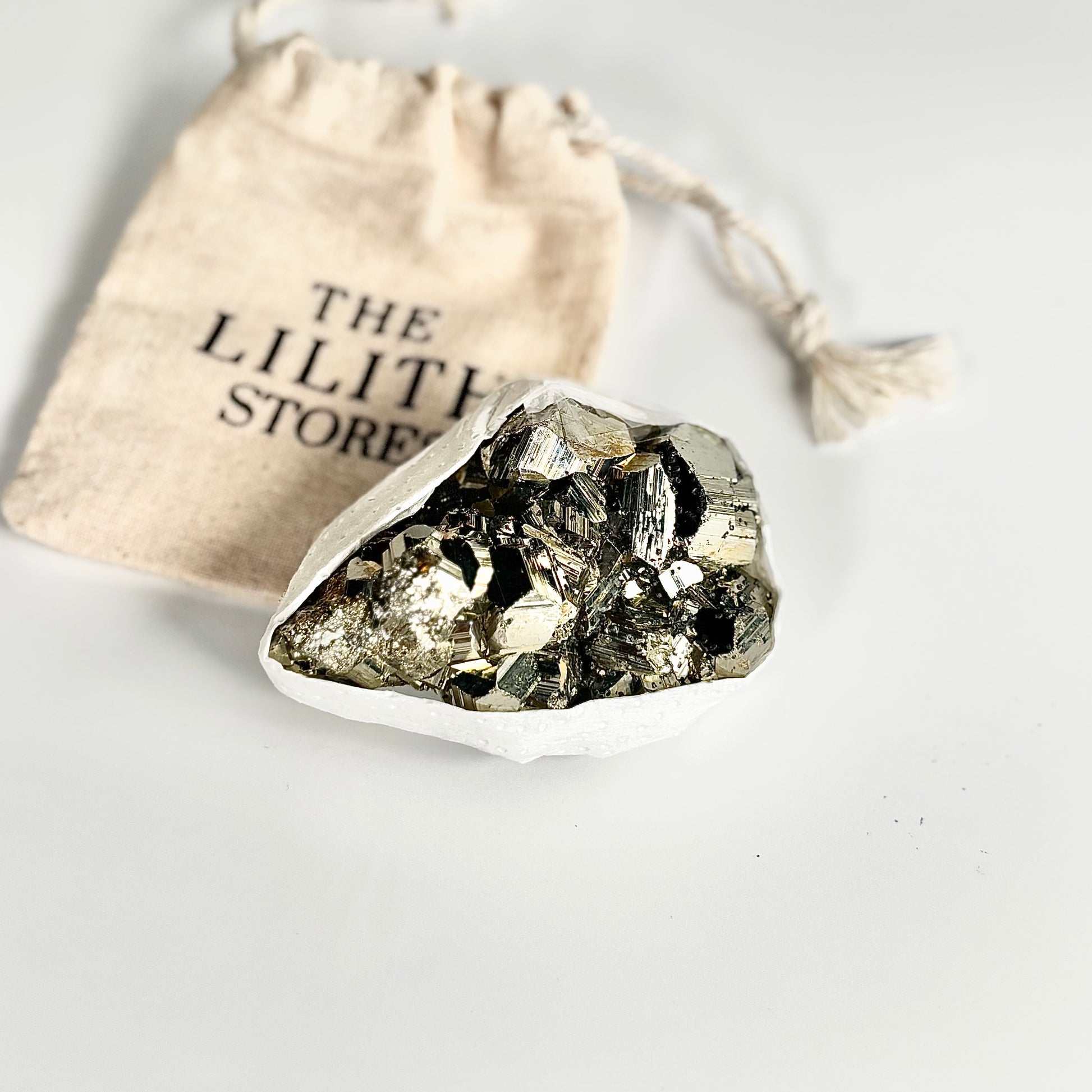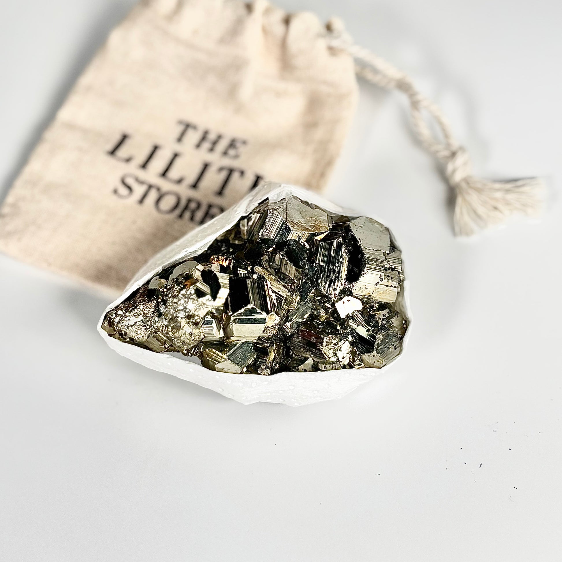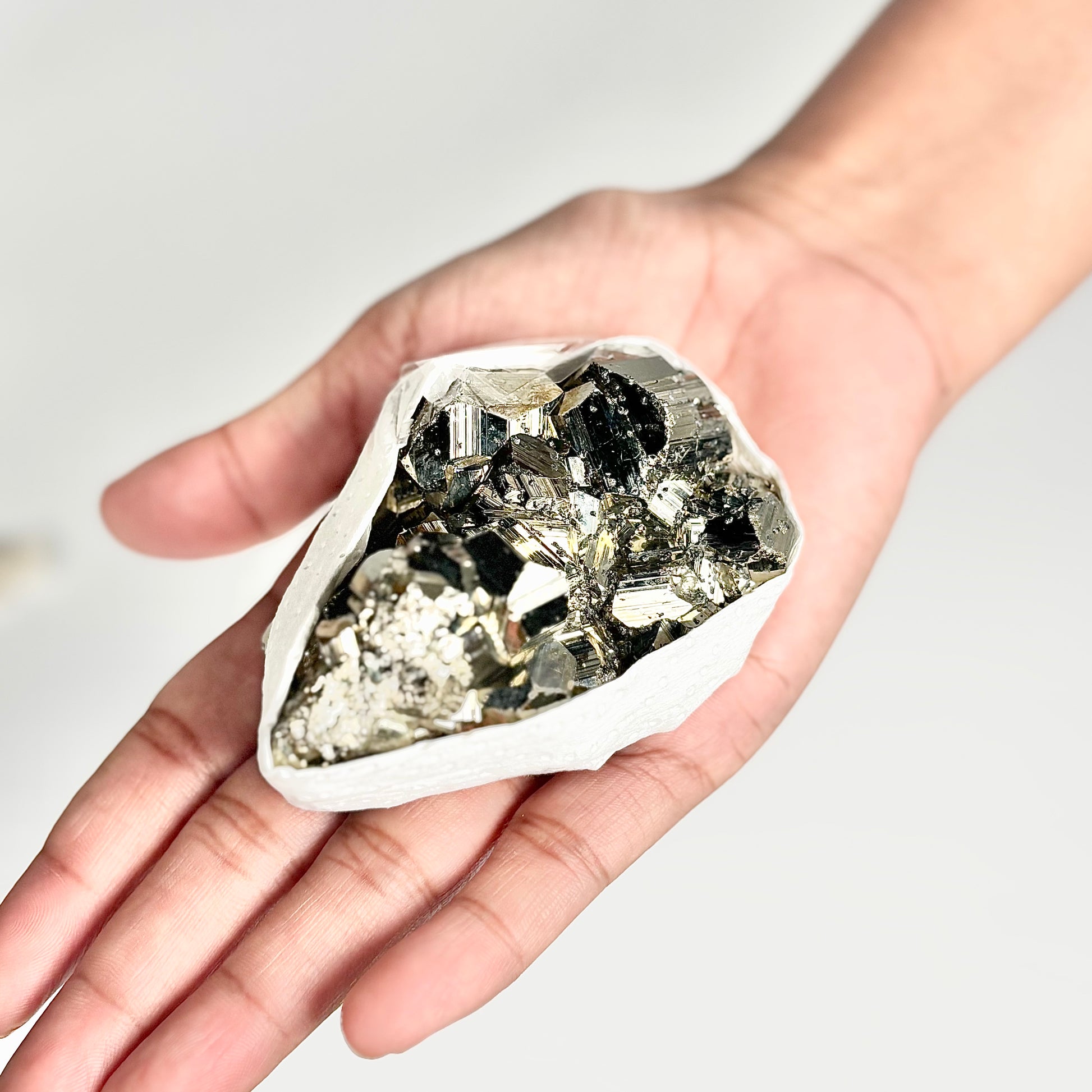 The Peruvian Pyrite Cluster is a natural formation of metallic golden cubes, admired for its geometric beauty and reflective sheen. This distinctive mineral is often associated with qualities such as motivation, confidence, and a strong, uplifting presence. Its bold appearance and natural luster make it a captivating choice for display in both modern and earthy interiors, adding a touch of sophistication and intrigue.