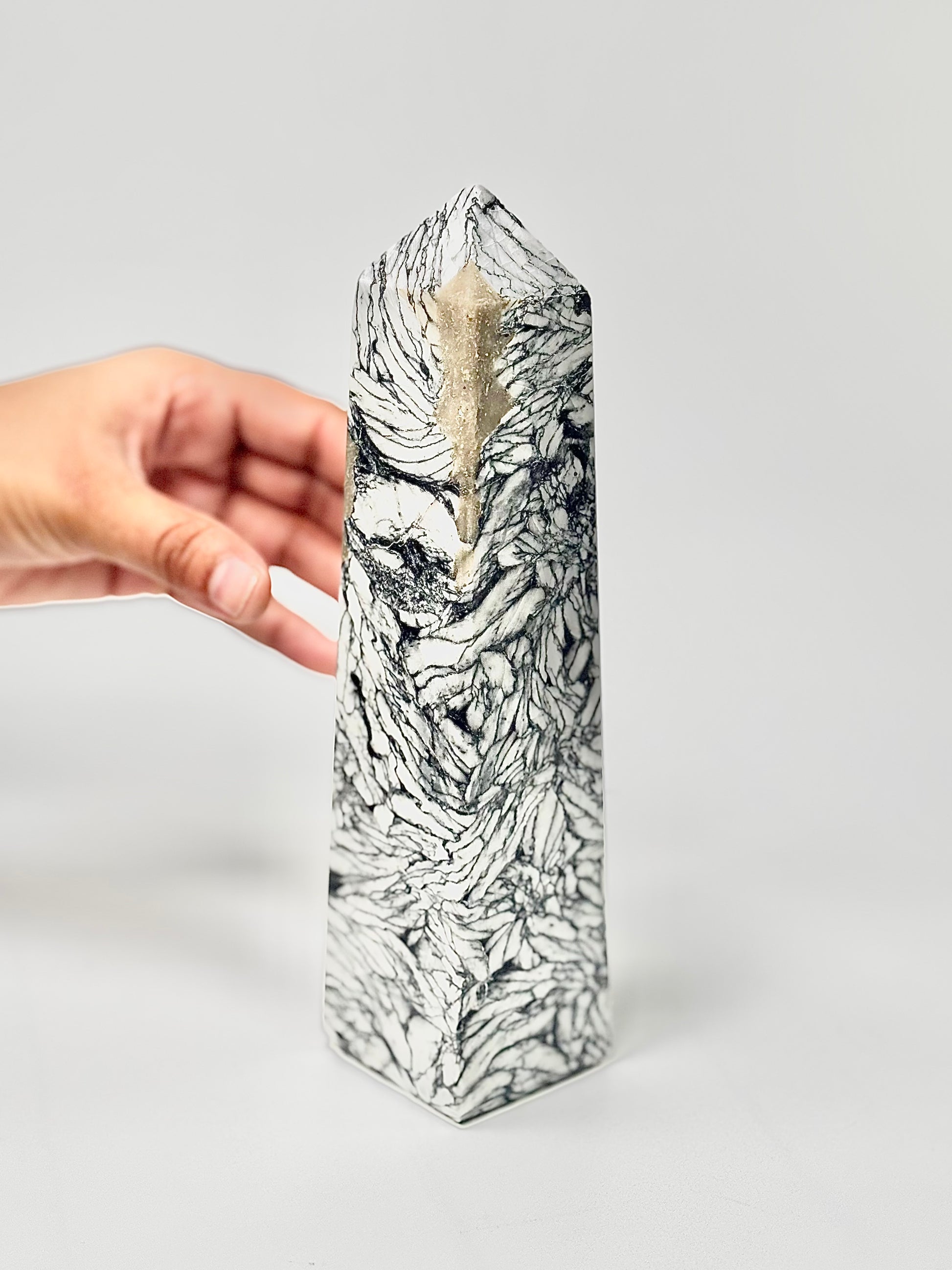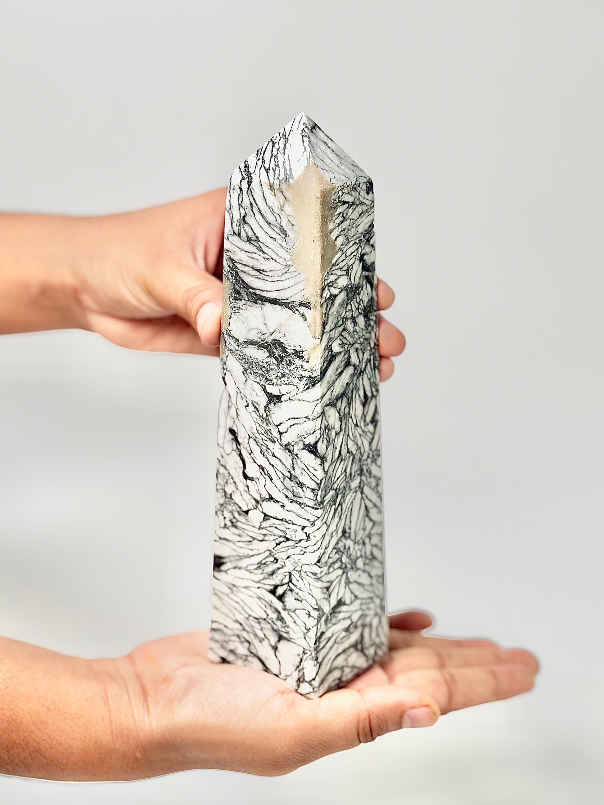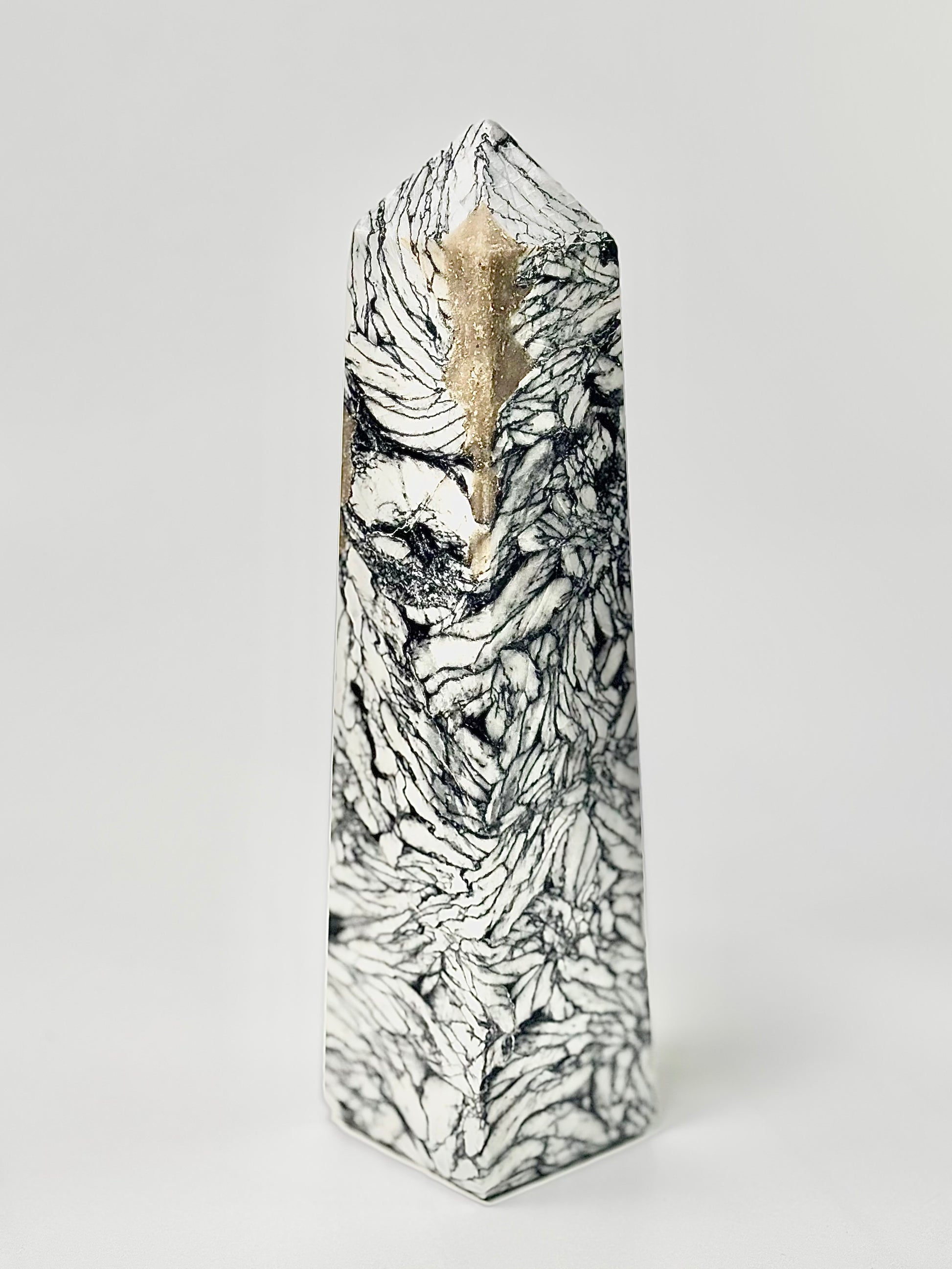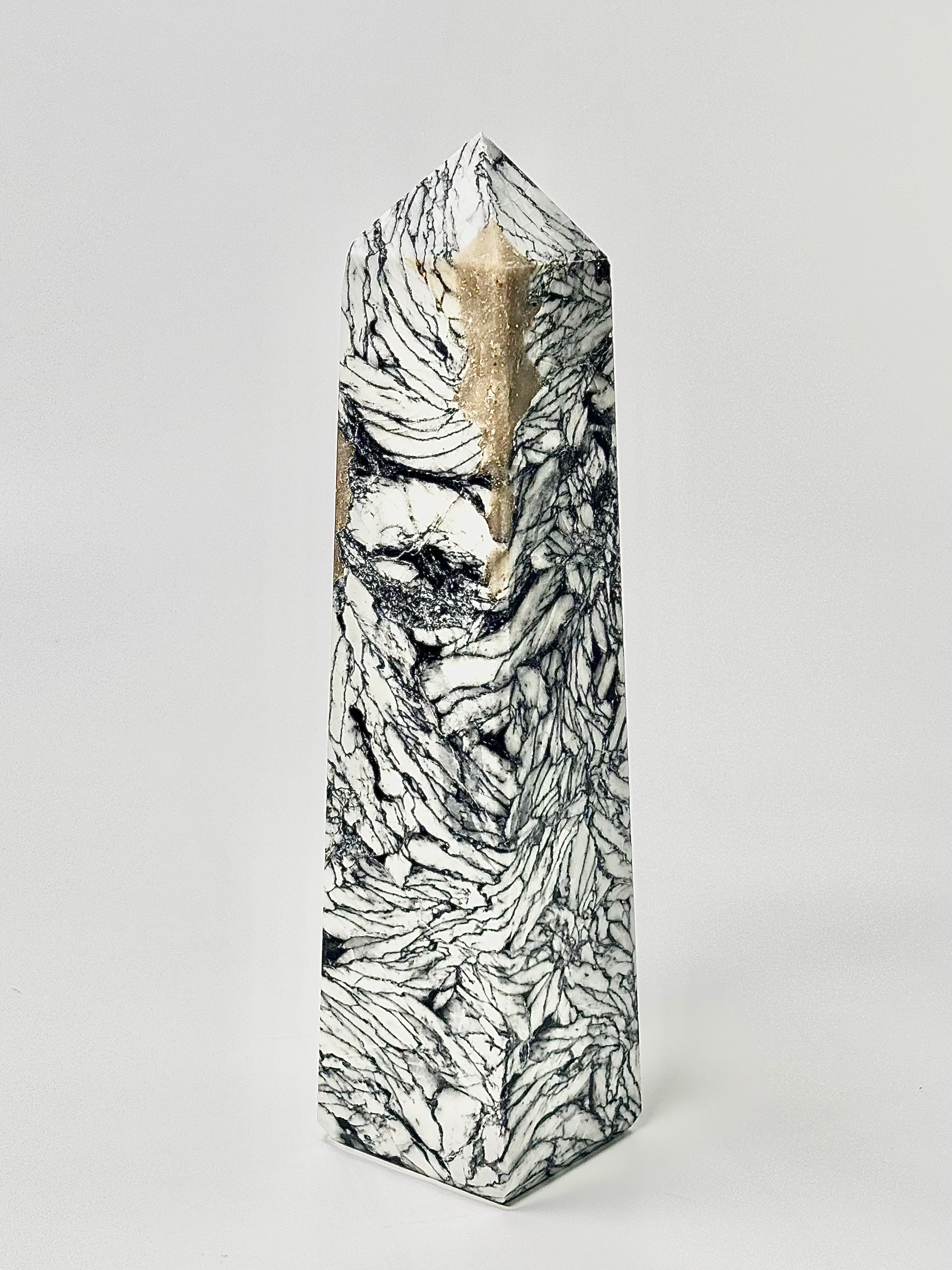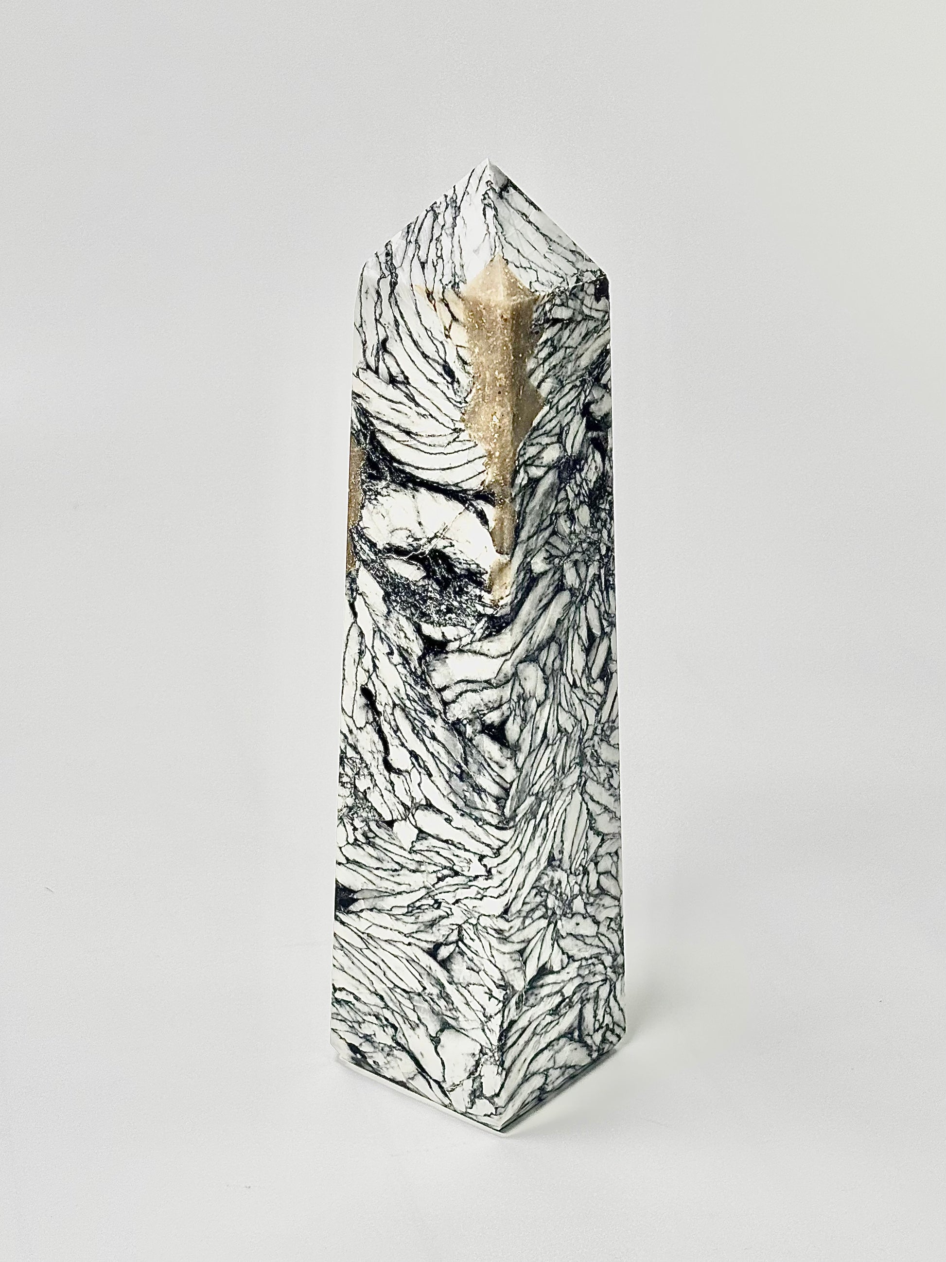 Elevate your space with the rare Pinolite Tower, carved into a four-facet point to amplify focus and intention. Pinolite, also known as “Pinolith,” is a unique blend of howlite, dolomite, and graphite, prized for its calming and balancing energy.