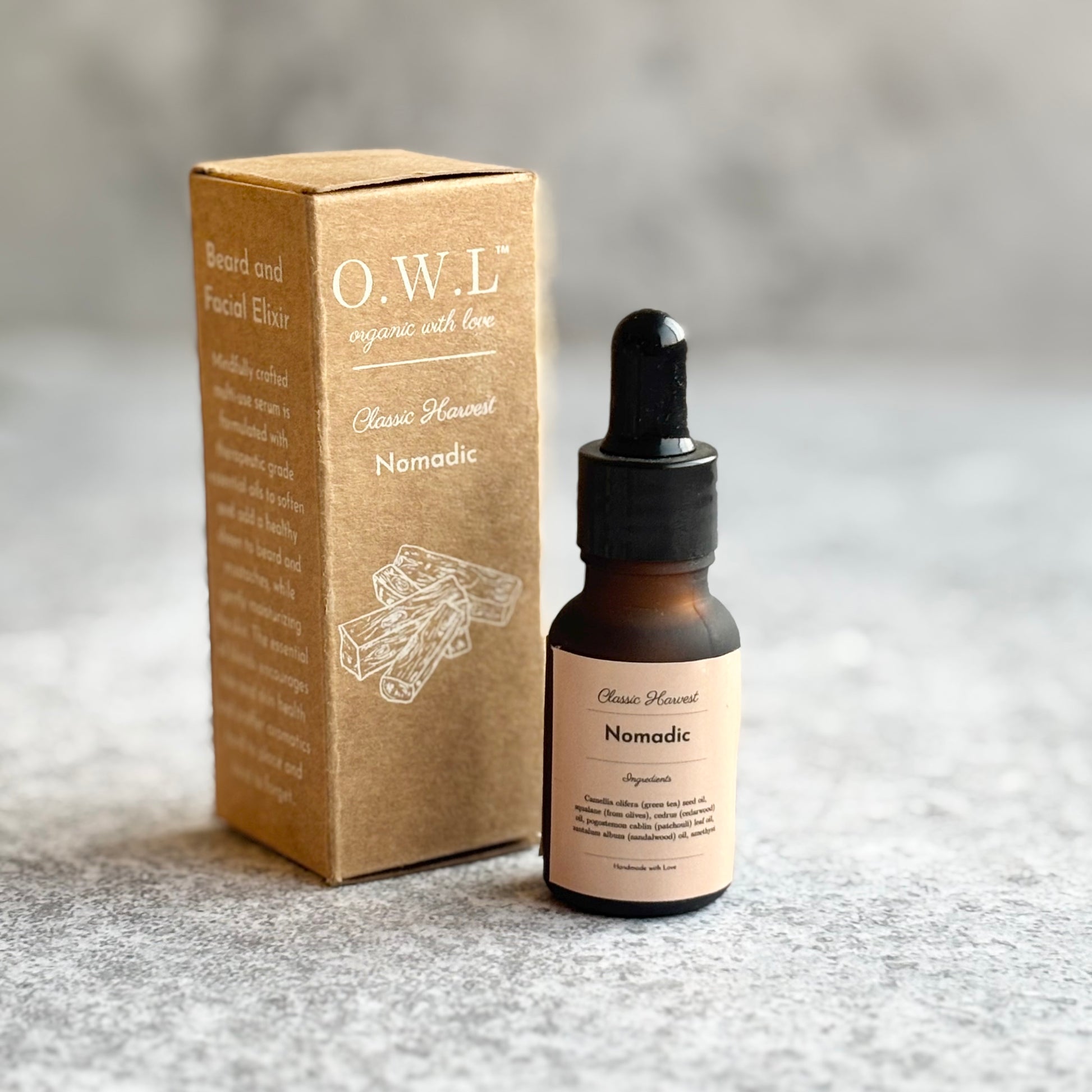 --- About --- "Nomadic" is a carefully crafted elixir designed to soften and enhance the health and appearance of your beard and mustache, while also providing gentle moisture to the skin. Formulated with therapeutic grade essential oils, this elixir offers a delightful aroma that lingers, leaving a lasting impression.