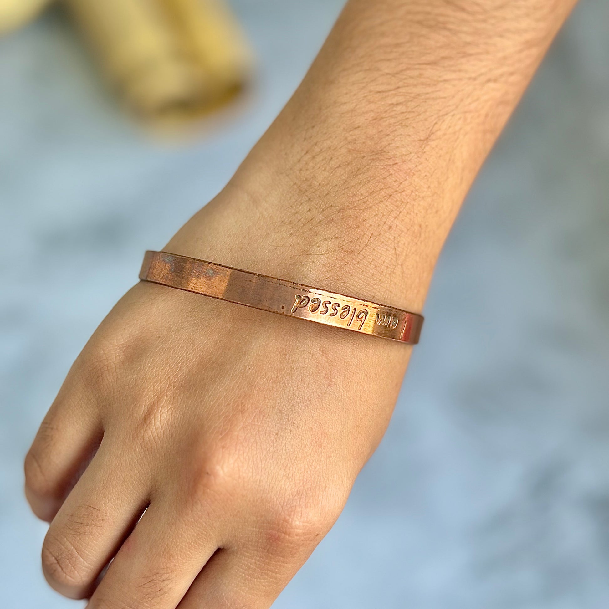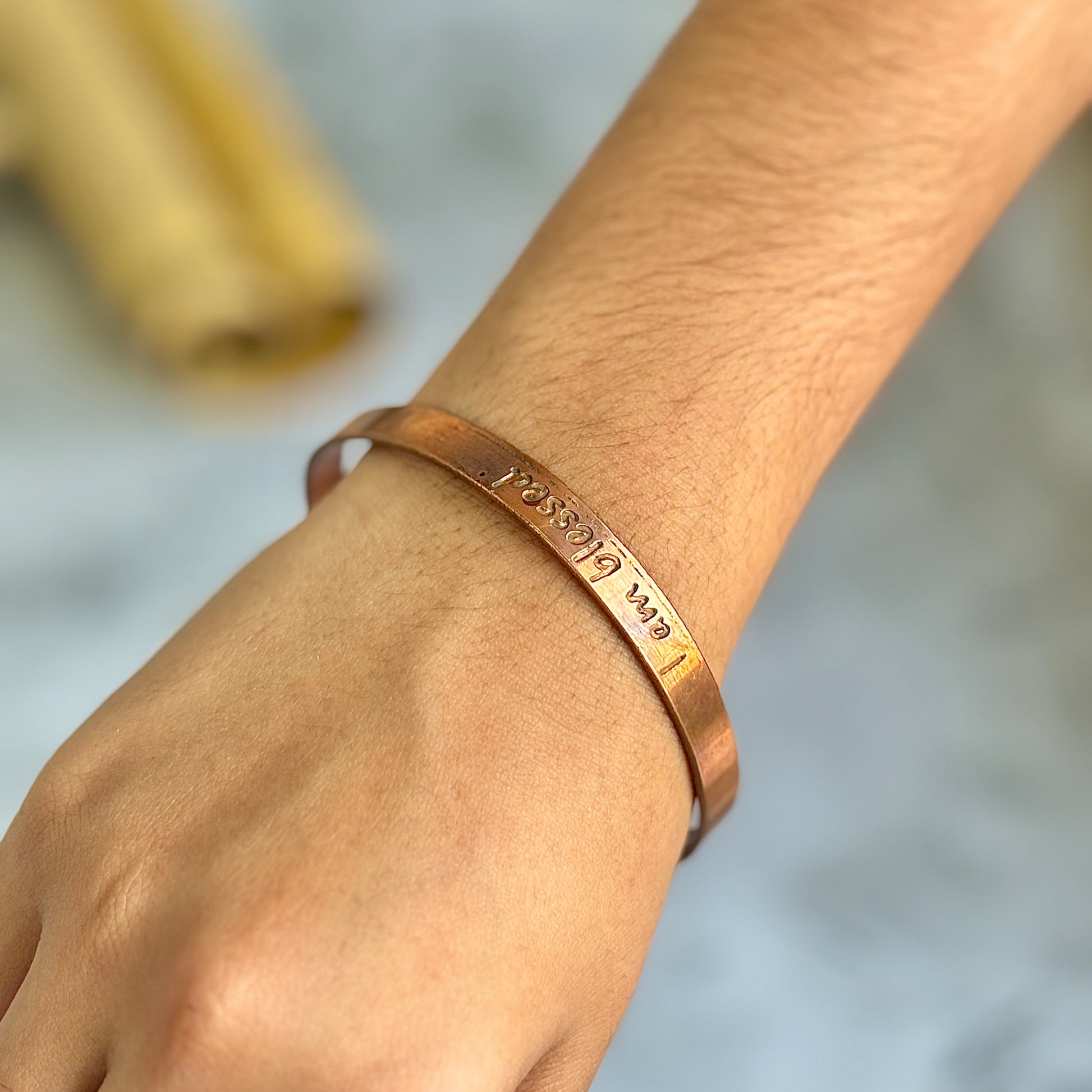 Crafted with stunning carved copper, the I am Blessed bracelet exudes elegance and positivity. Its intricate design serves as a reminder of the blessings in life. Embrace its beautiful craftsmanship and let it bring positive energy with you wherever you go.