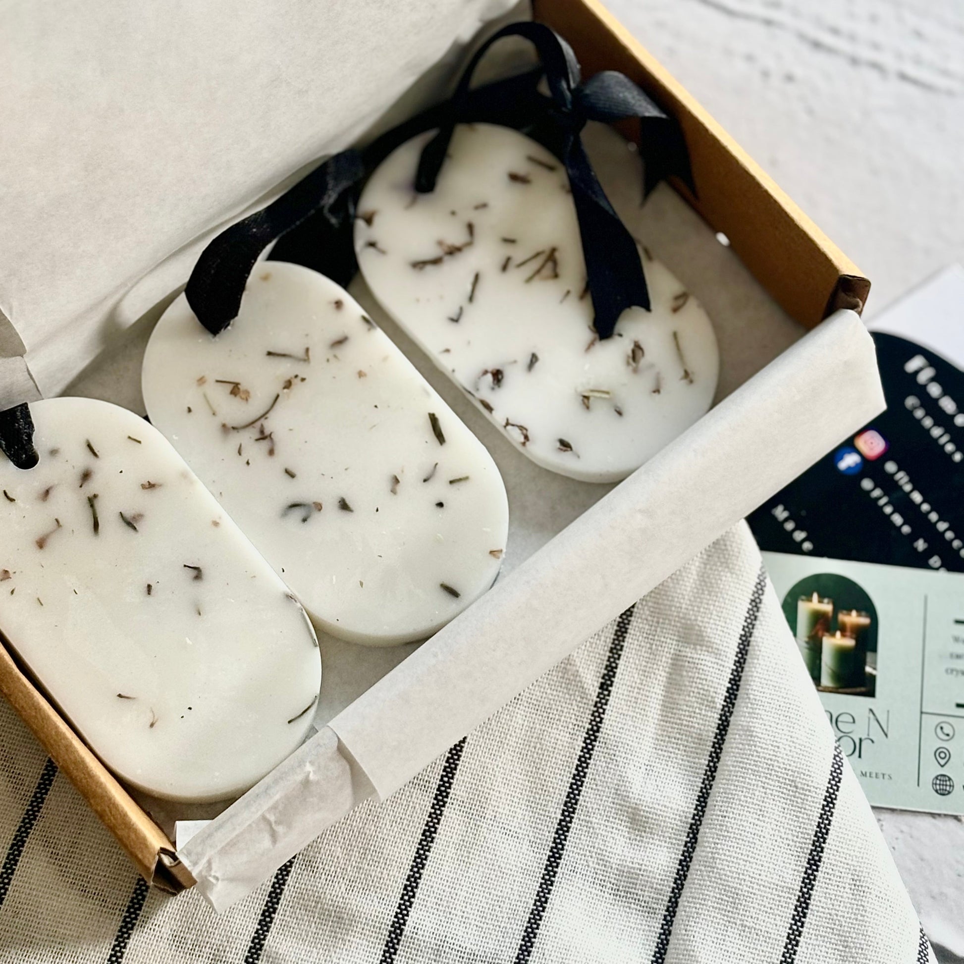Enhance your space with the refreshing scent of lavender. Our Oval Lavender Buds & Lavender Scented Soy Wax Sachet come in a pack of 3 and are perfect for your car, washroom, and closets. Enjoy the calming and soothing benefits of lavender wherever you go.