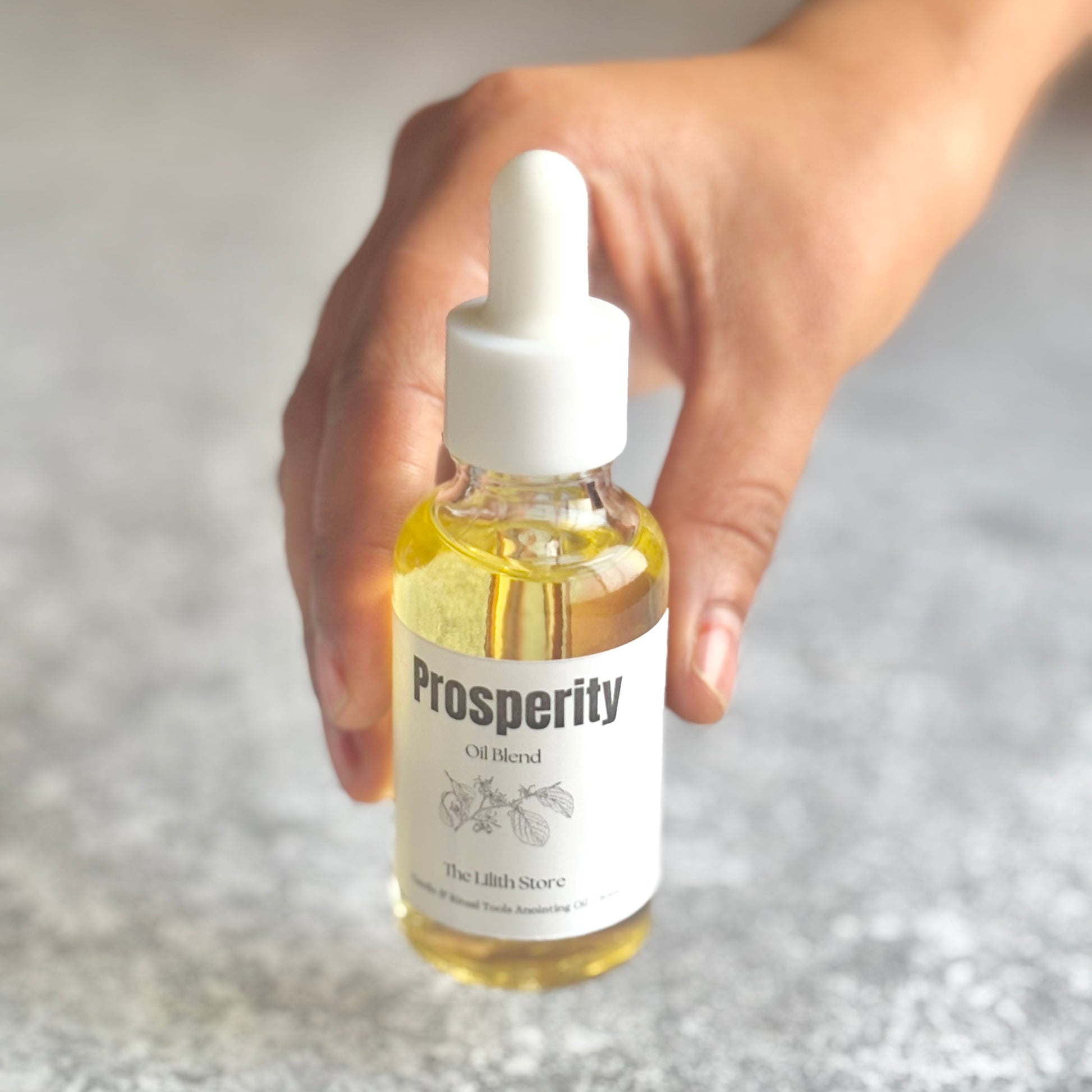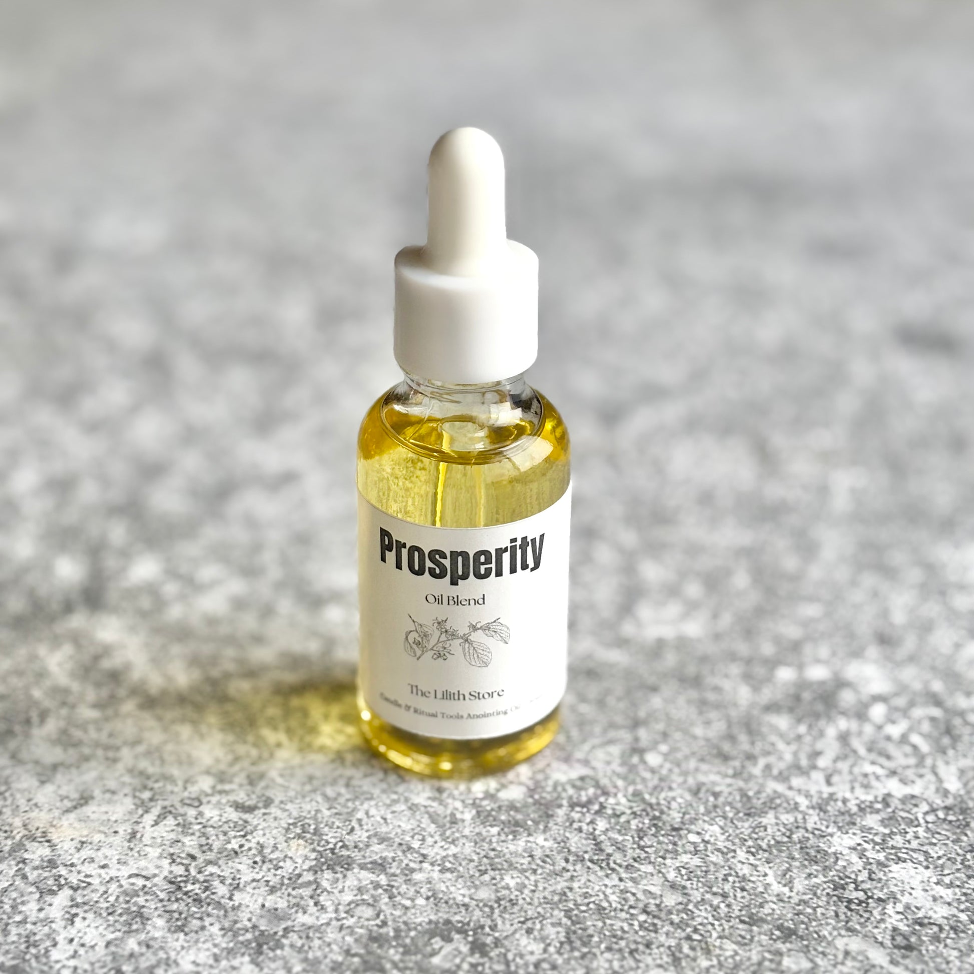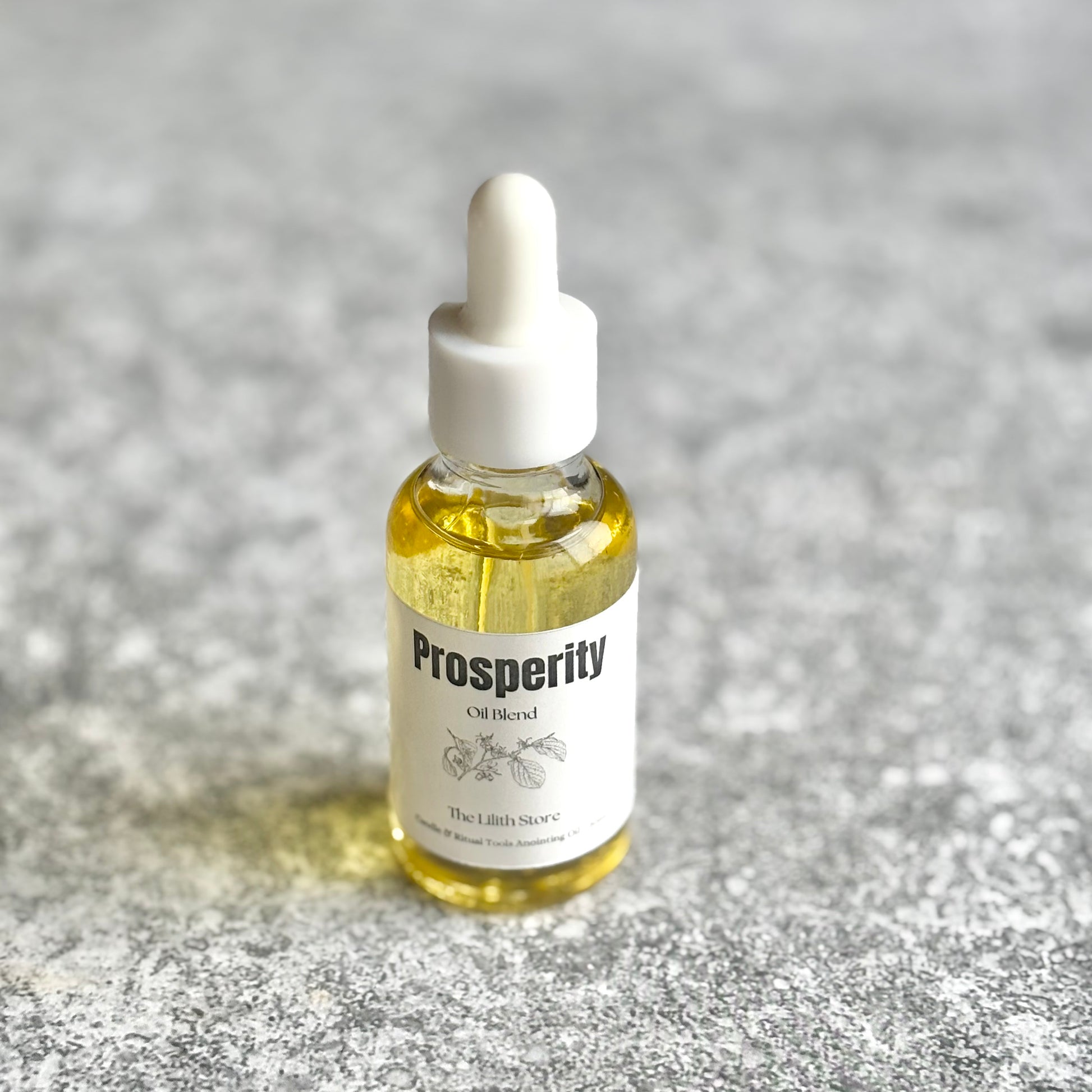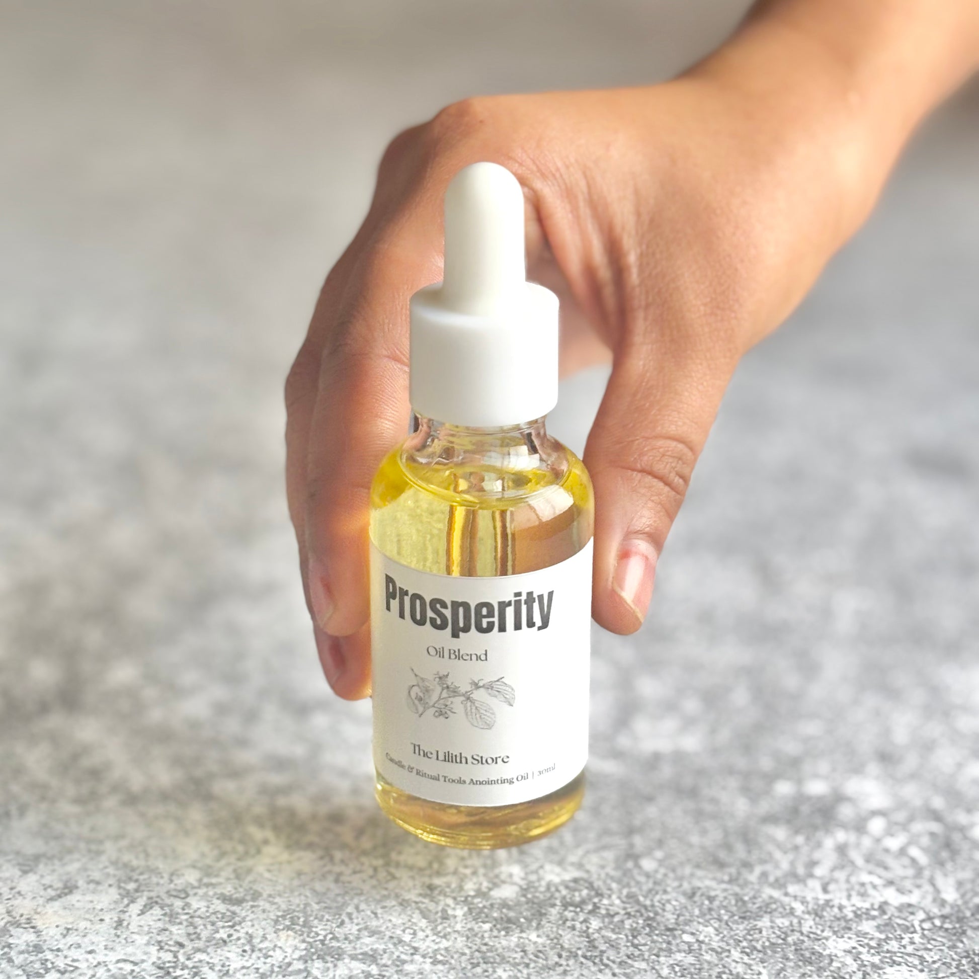 Prosperity Oil Blend infused with potent herbs and roots, crafted to amplify your rituals. Perfect for anointing candles, tools, and other sacred objects. Each bottle contains a piece of High John Root to ensure its potency.
