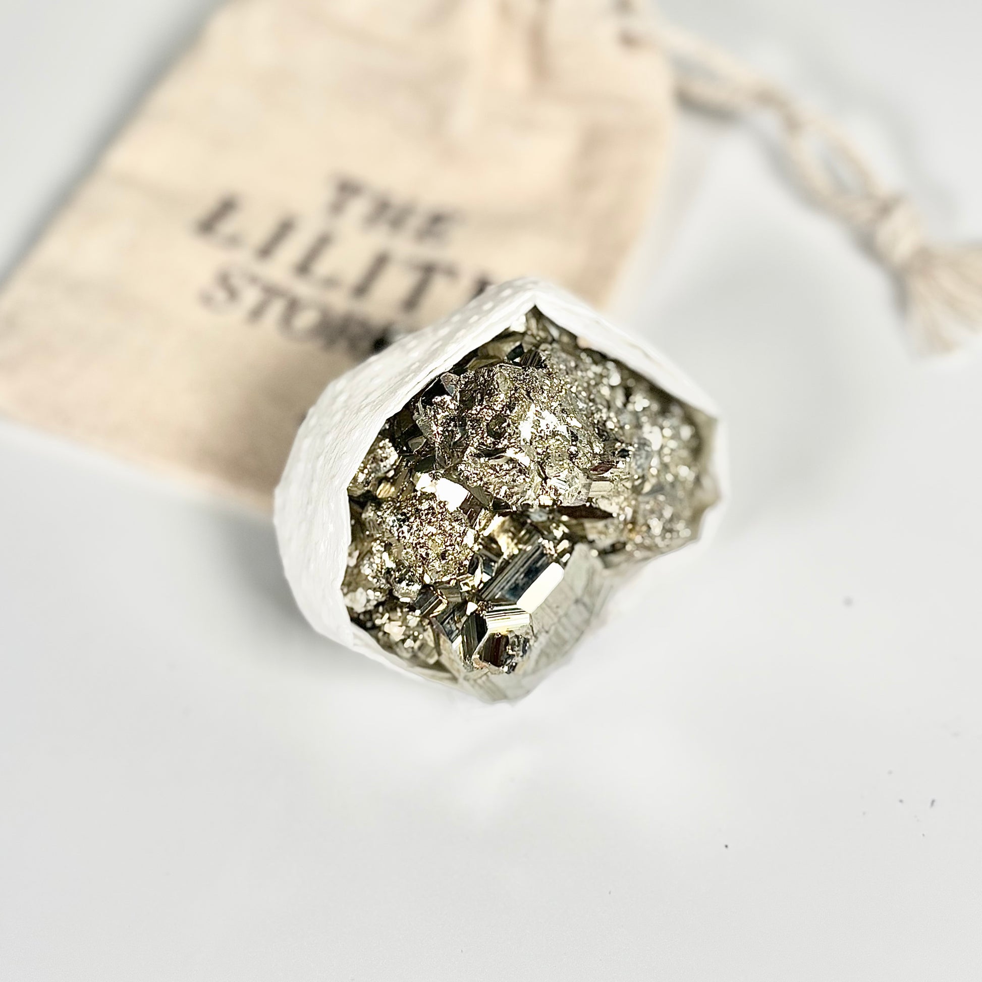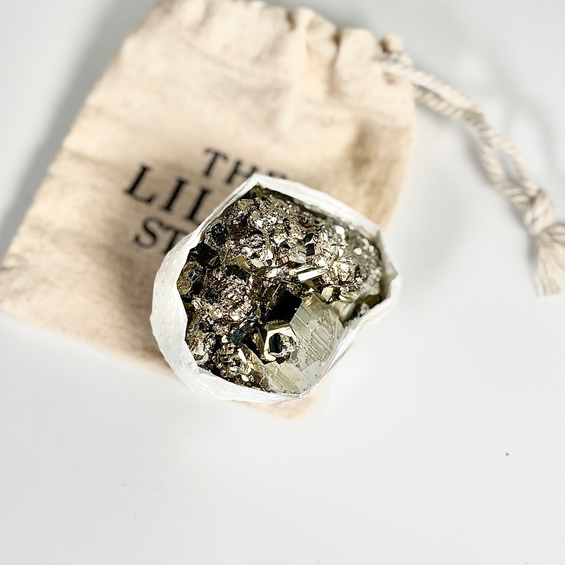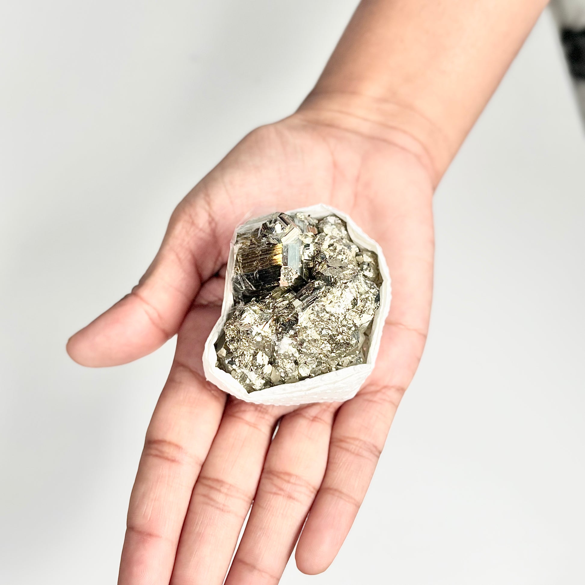 The Peruvian Pyrite Cluster is a natural formation of metallic golden cubes, admired for its geometric beauty and reflective sheen. This distinctive mineral is often associated with qualities such as motivation, confidence, and a strong, uplifting presence. Its bold appearance and natural luster make it a captivating choice for display in both modern and earthy interiors, adding a touch of sophistication and intrigue.