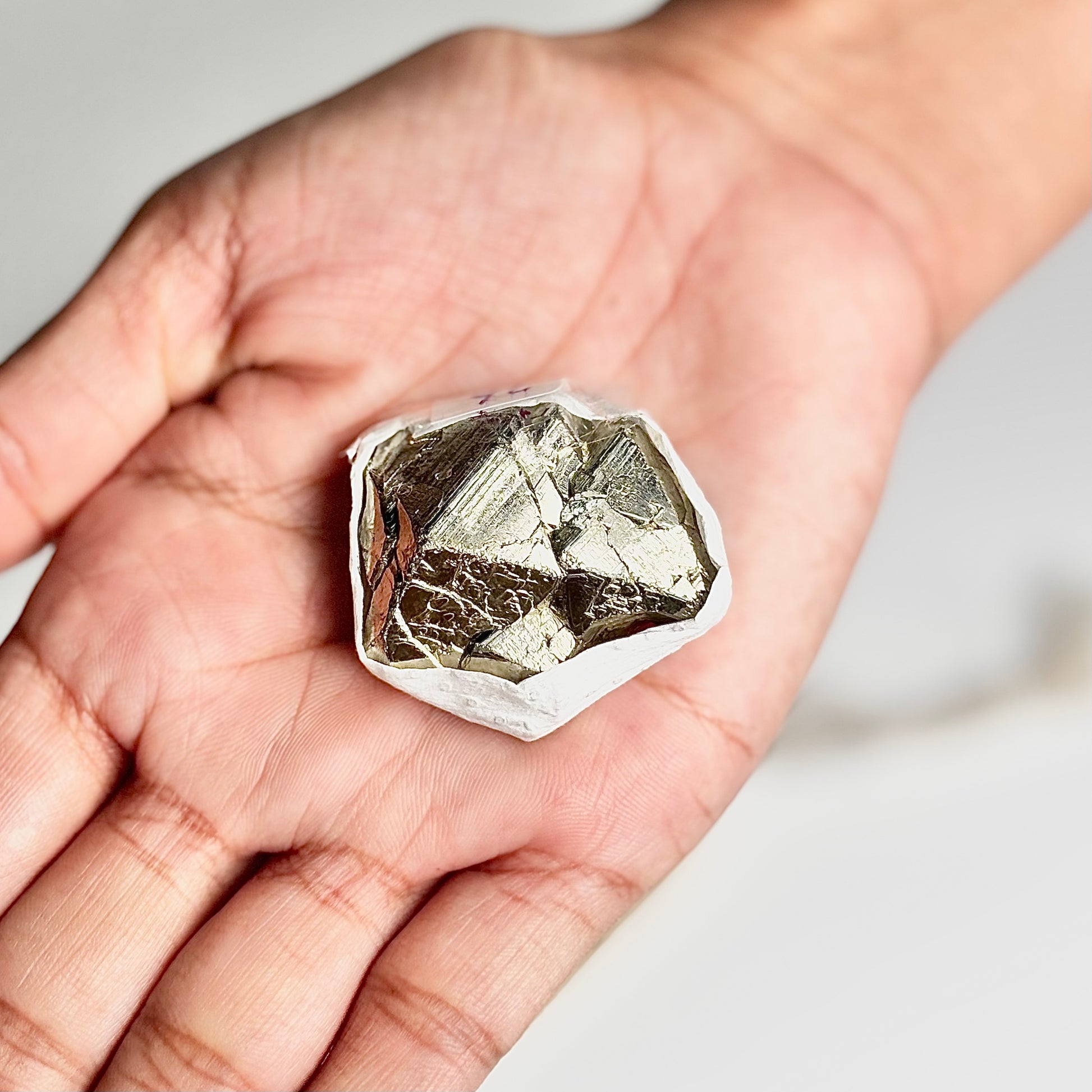 The Peruvian Pyrite Cluster is a natural formation of metallic golden cubes, admired for its geometric beauty and reflective sheen. This distinctive mineral is often associated with qualities such as motivation, confidence, and a strong, uplifting presence. Its bold appearance and natural luster make it a captivating choice for display in both modern and earthy interiors, adding a touch of sophistication and intrigue.