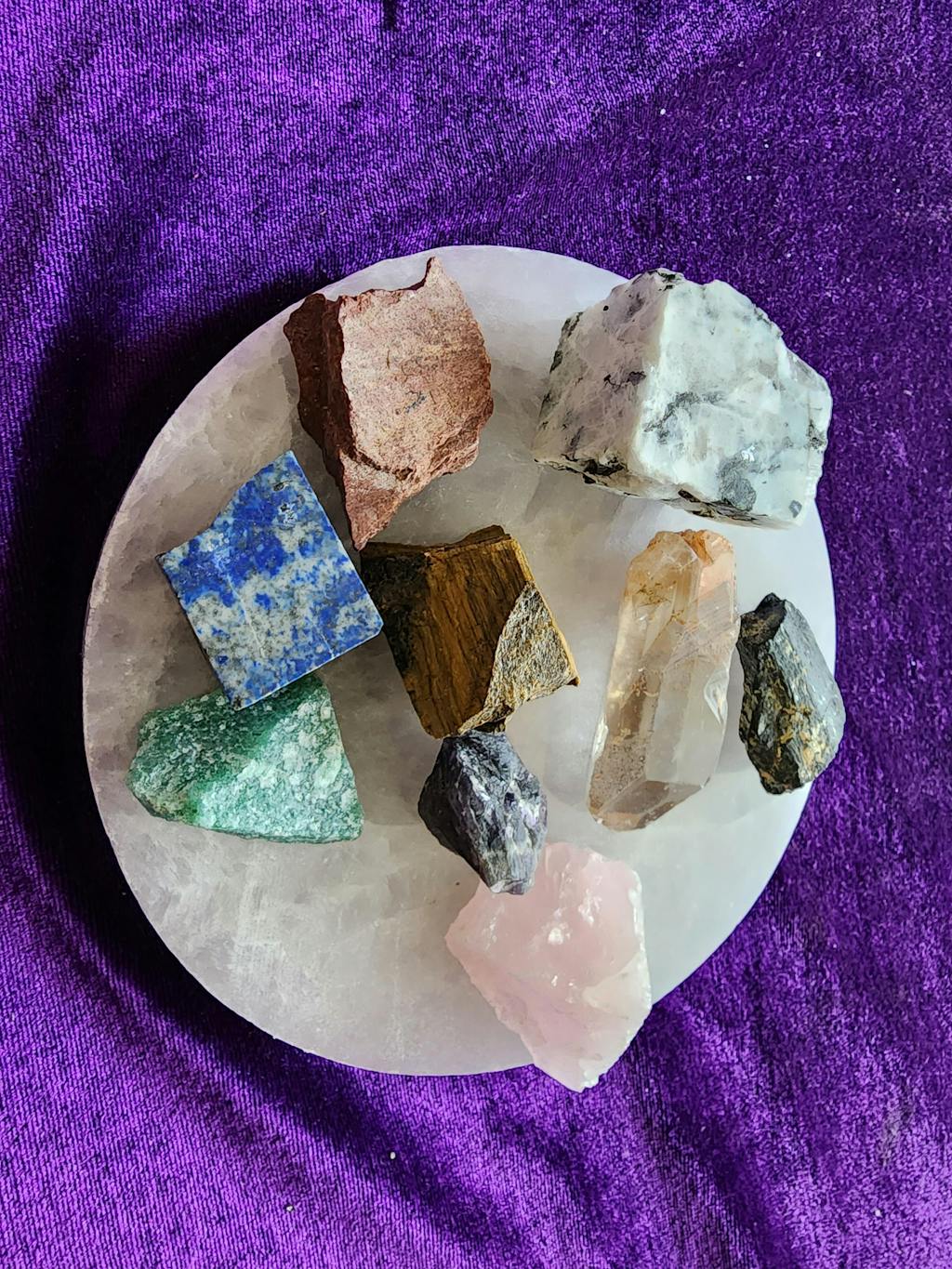 This set includes 9 raw stones, each offering unique energy and benefits for various practices like meditation and rituals. The stones in the set are: