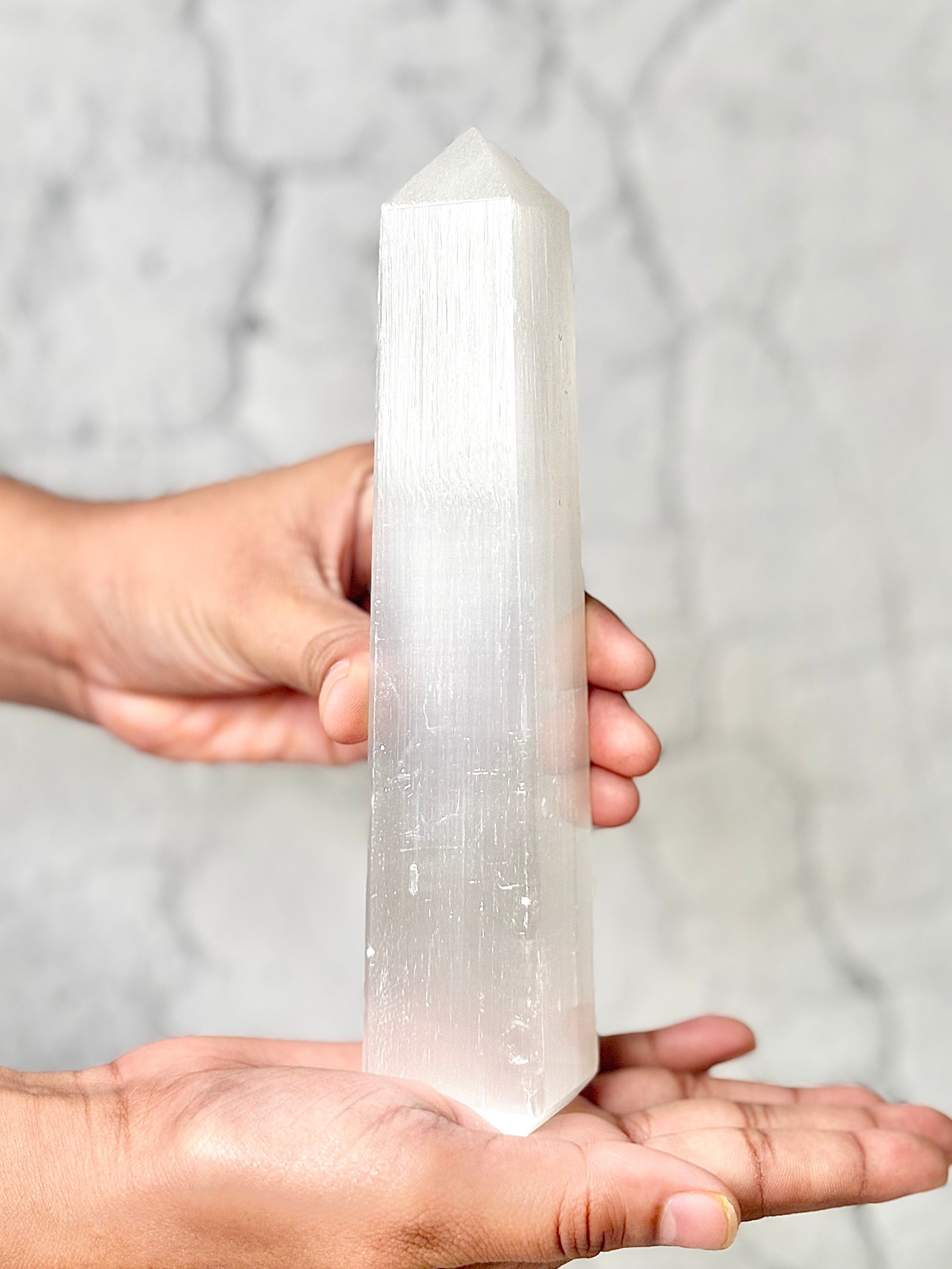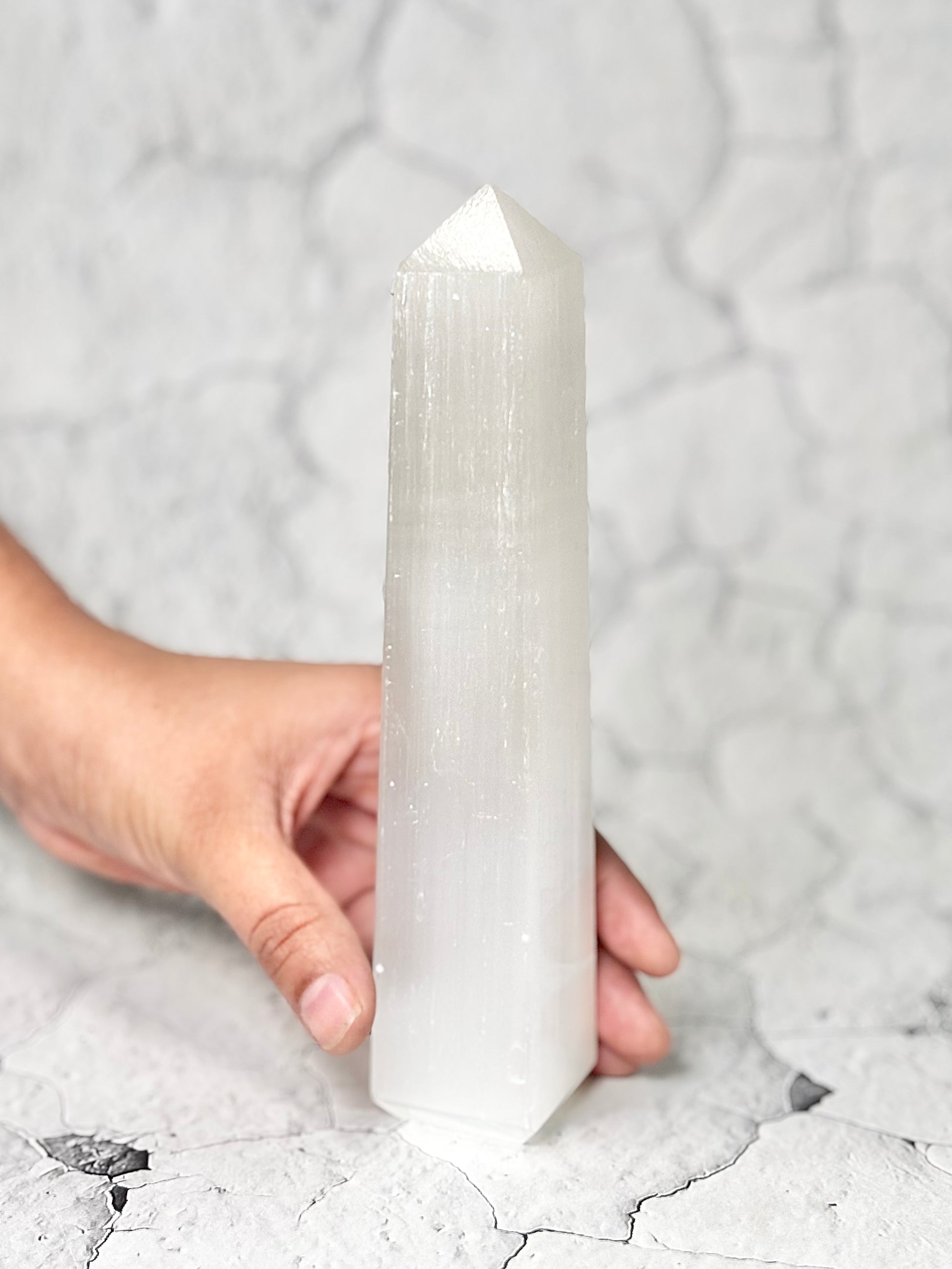 The Four Facet Selenite Tower features a smooth, pearly-white finish that captures and reflects light beautifully. Shaped with four clean facets, it offers a stable, grounded form while maintaining an elegant simplicity. Selenite is admired for its luminous appearance and is often associated with clarity, freshness, and a calm, uplifting presence. Its understated beauty makes it a versatile addition to both minimalist and nature-inspired décor styles.