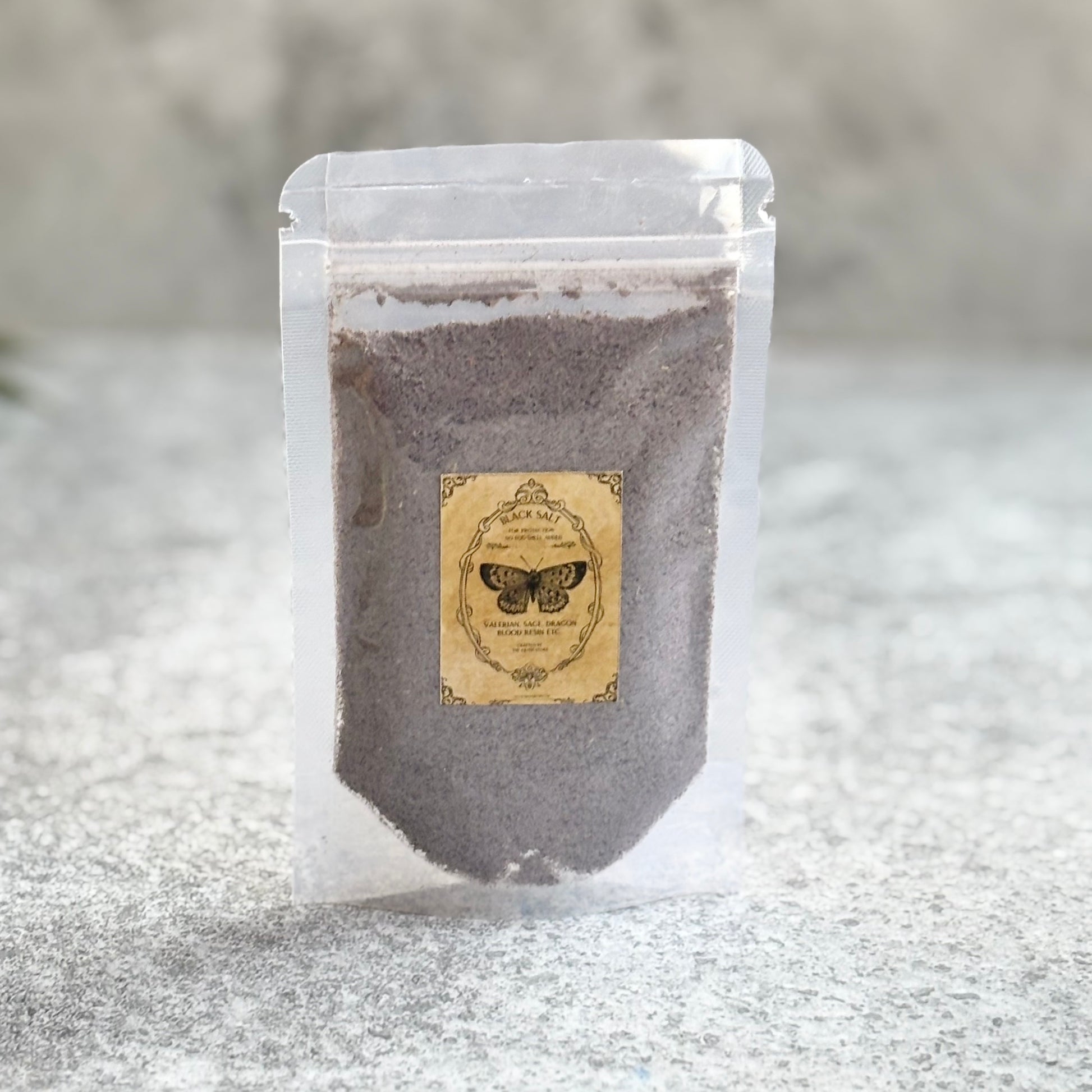 Black salt is a powerful ingredient commonly used for protection, banishing, and cleansing. Its base of sea salt is combined with ingredients like charcoal, valerian, sage, dragon’s blood resin, bay leaves, and black pepper and More each adding their own protective and purifying qualities. Black salt is often sprinkled around a space to ward off negative energies or unwanted influences. It can be placed in doorways and windowsills to prevent negative energies from entering or used to banish negativity and protect against unwanted influences. Additionally, it can be used in jars or sachets for personal protection and carried to provide a shield against harmful influences throughout the day.