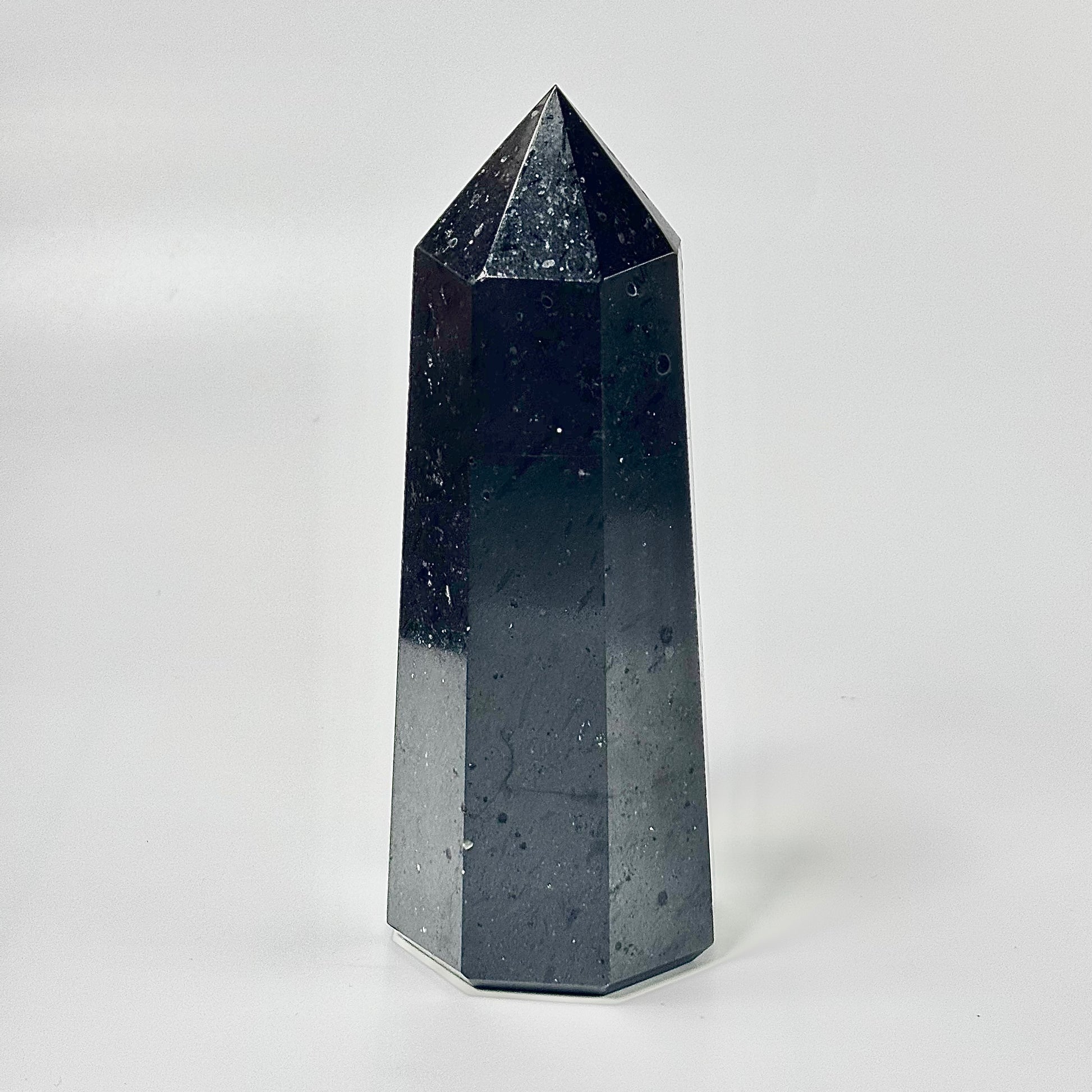 The Eight Facet Black Tourmaline Tower is a striking natural-stone piece with a deep black lustre and clean, symmetrical lines. Its eight-facet cut reflects light subtly while adding a sense of balance and refinement to any space.