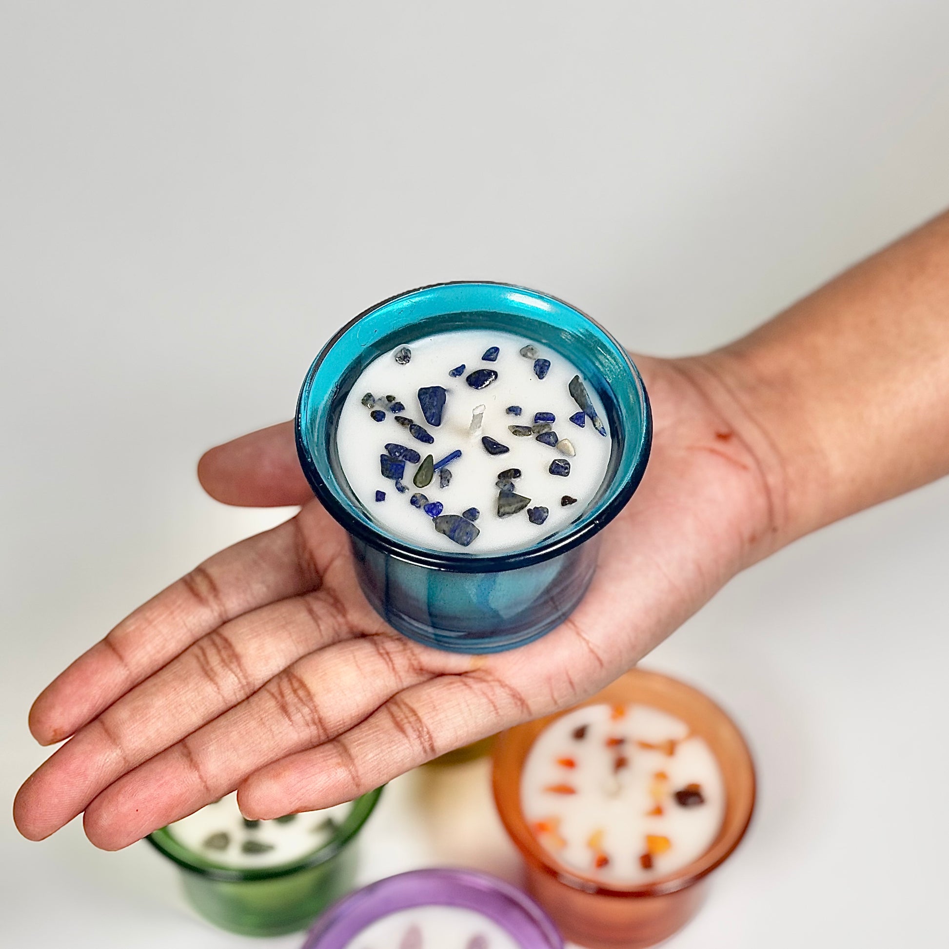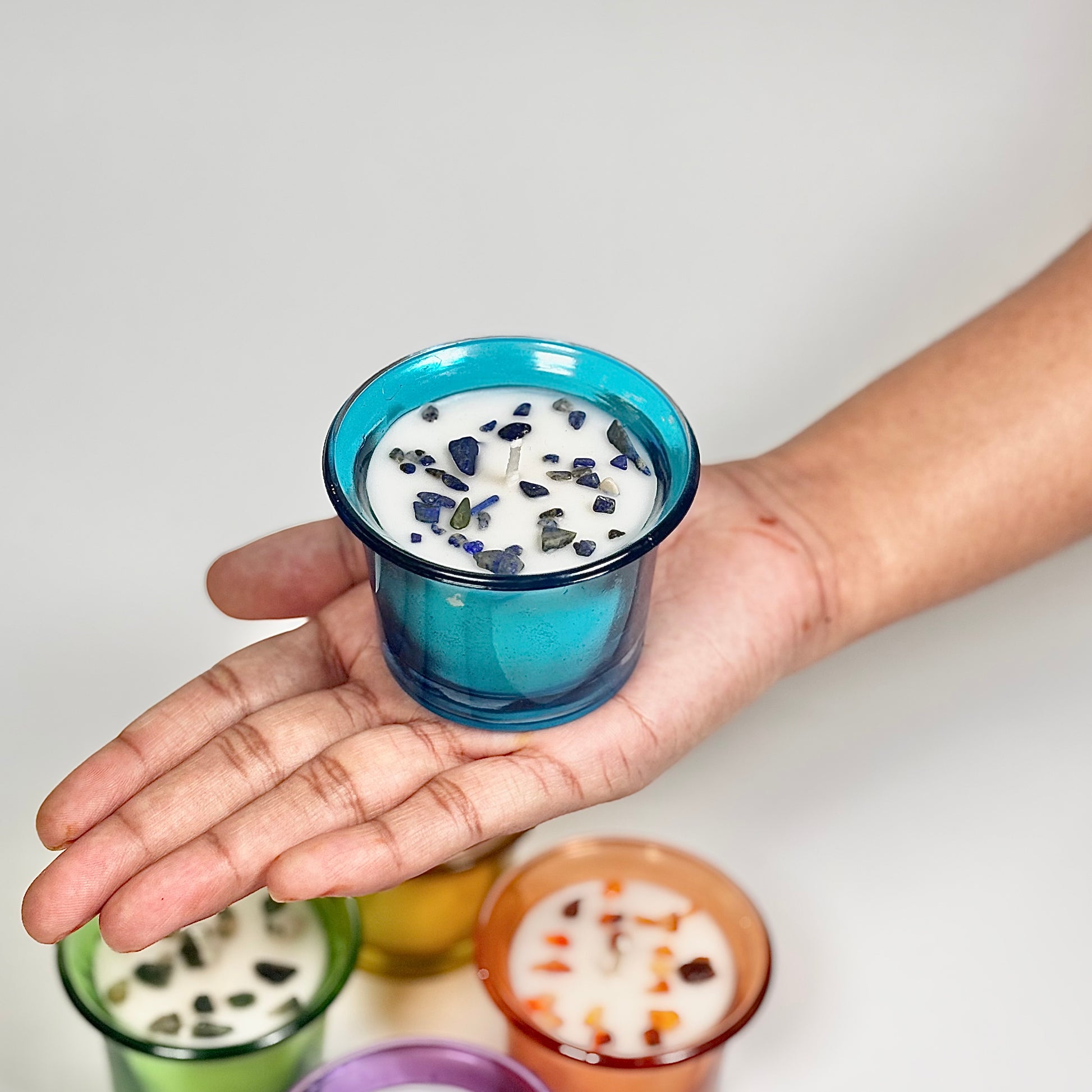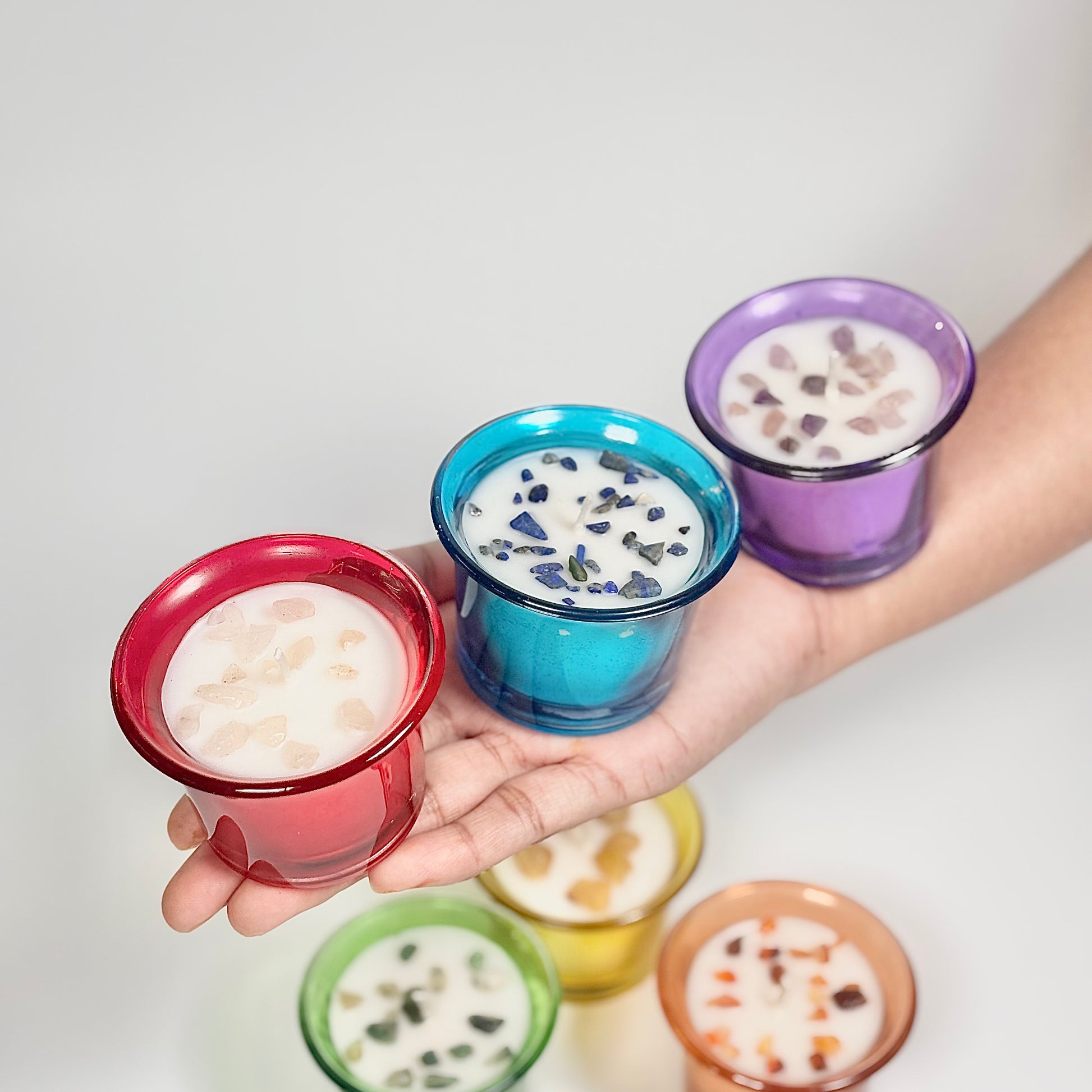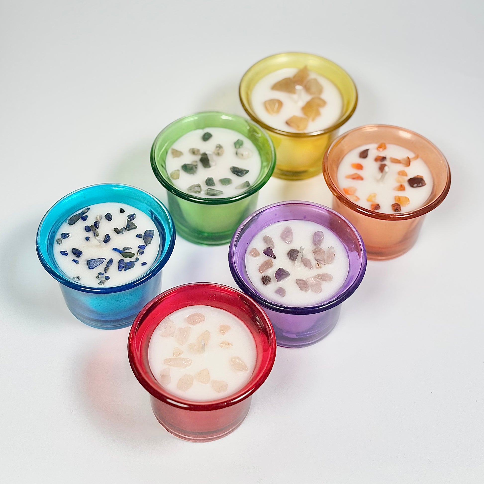 Light up your space with this enchanting set of 6 crystal-infused tealights, each made with natural soy wax and a gentle fragrance.