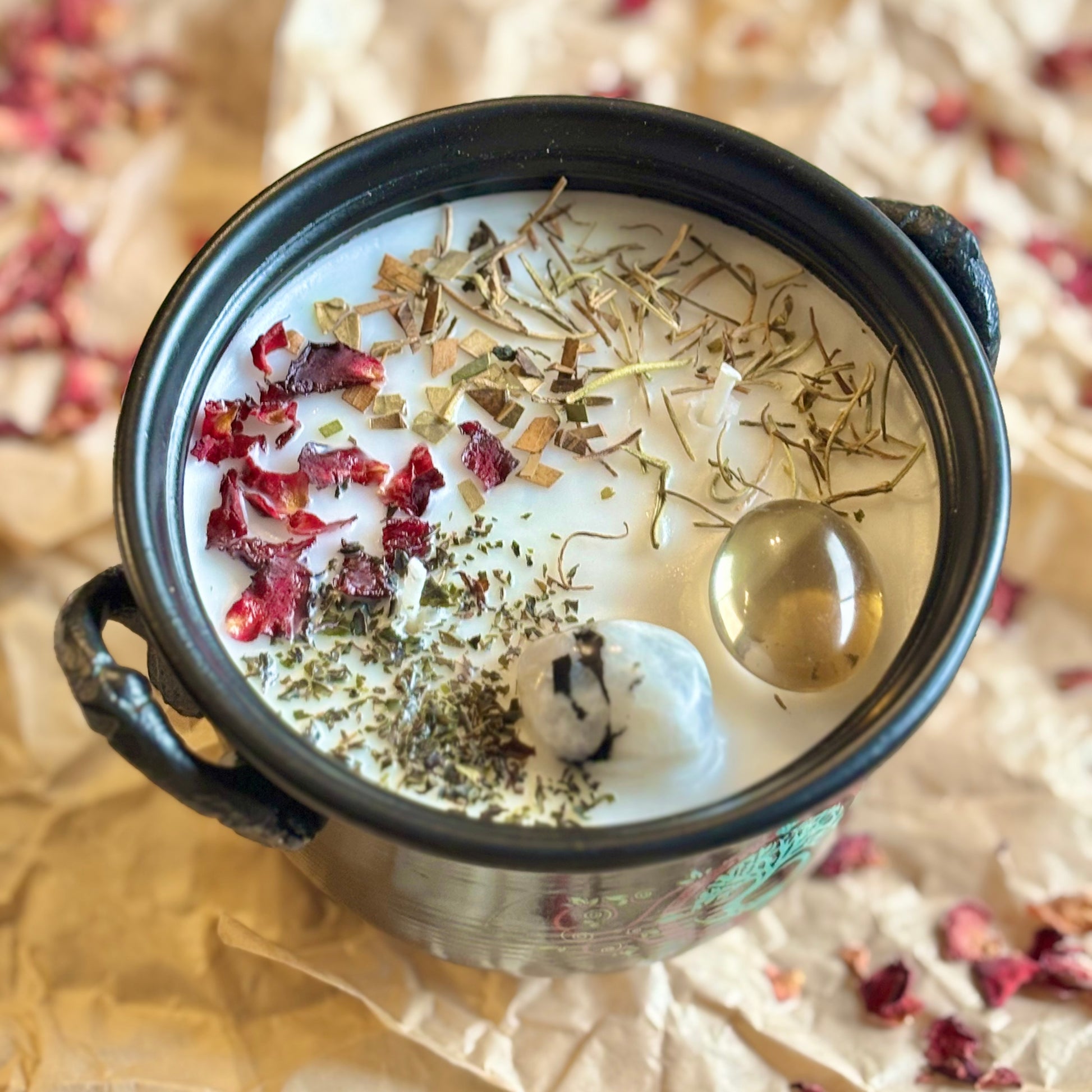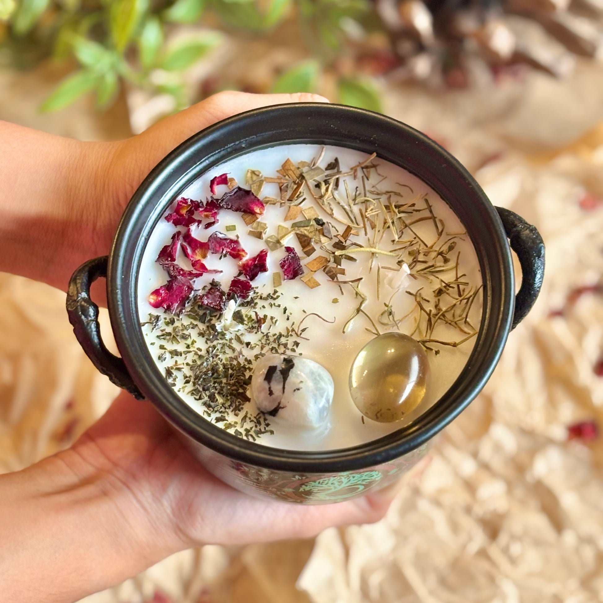 TThe Tree of Life Cauldron Candle features Smoky Quartz for grounding and stability, and Moonstone for new beginnings and growth. Light the candle during times of transformation or when seeking strength and courage. Once finished, the cauldron can be reused in your practice.