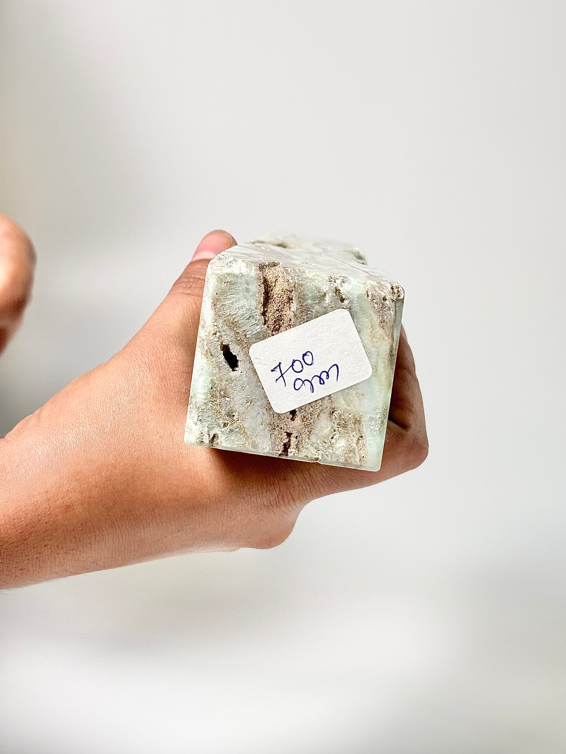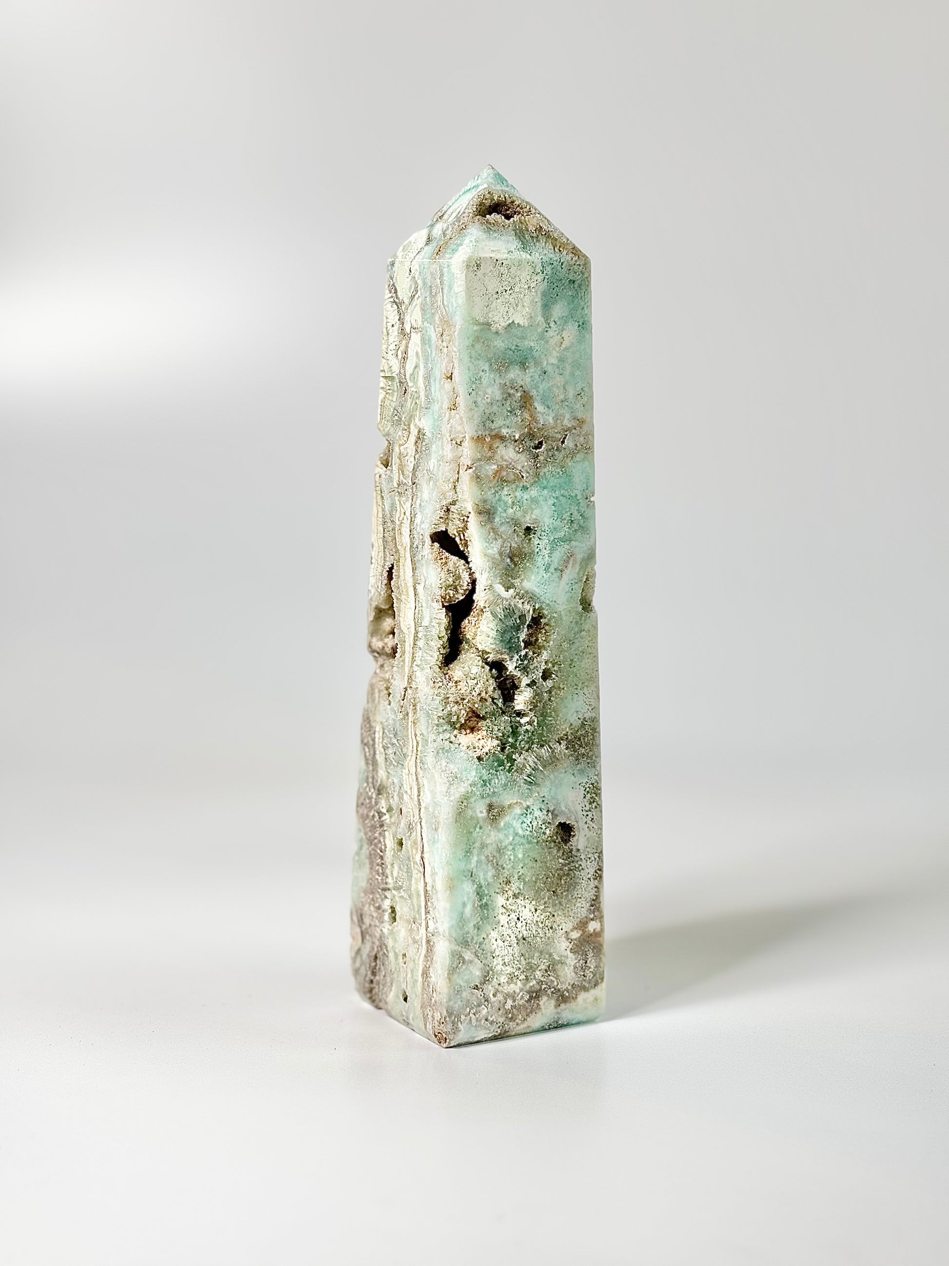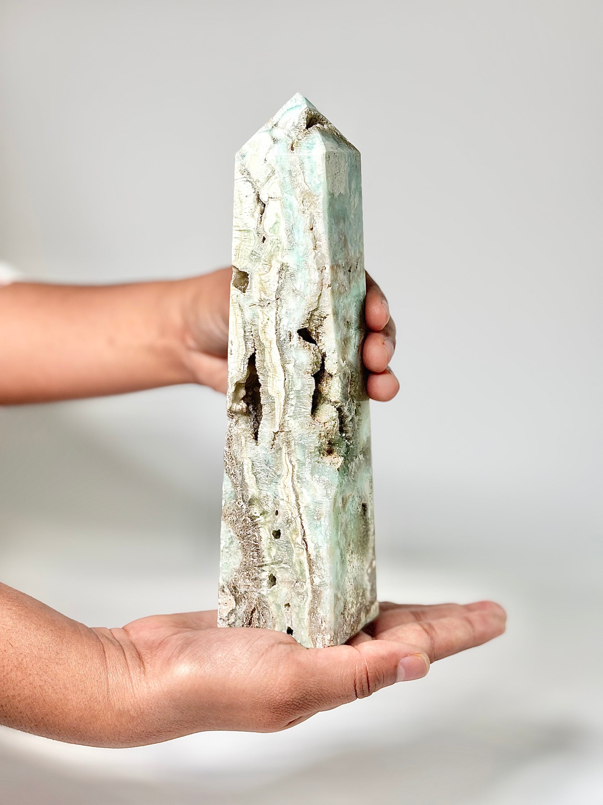 Embrace soothing energy with our natural Blue Aragonite four-facet tower, a stone known for its gentle vibrations that support emotional healing, clear communication, and inner peace. Its serene blue tones help calm the mind, ease tension, and promote spiritual connection.