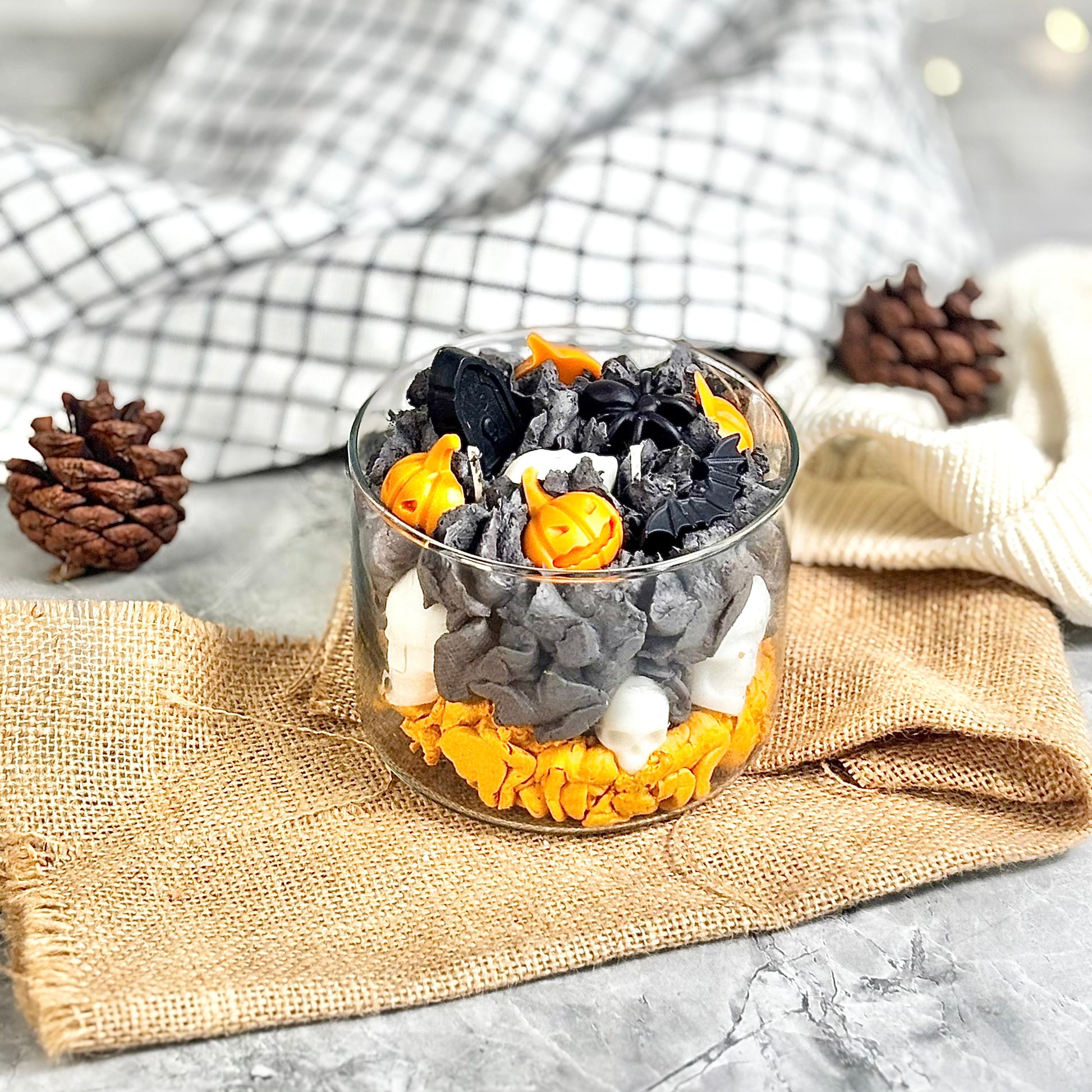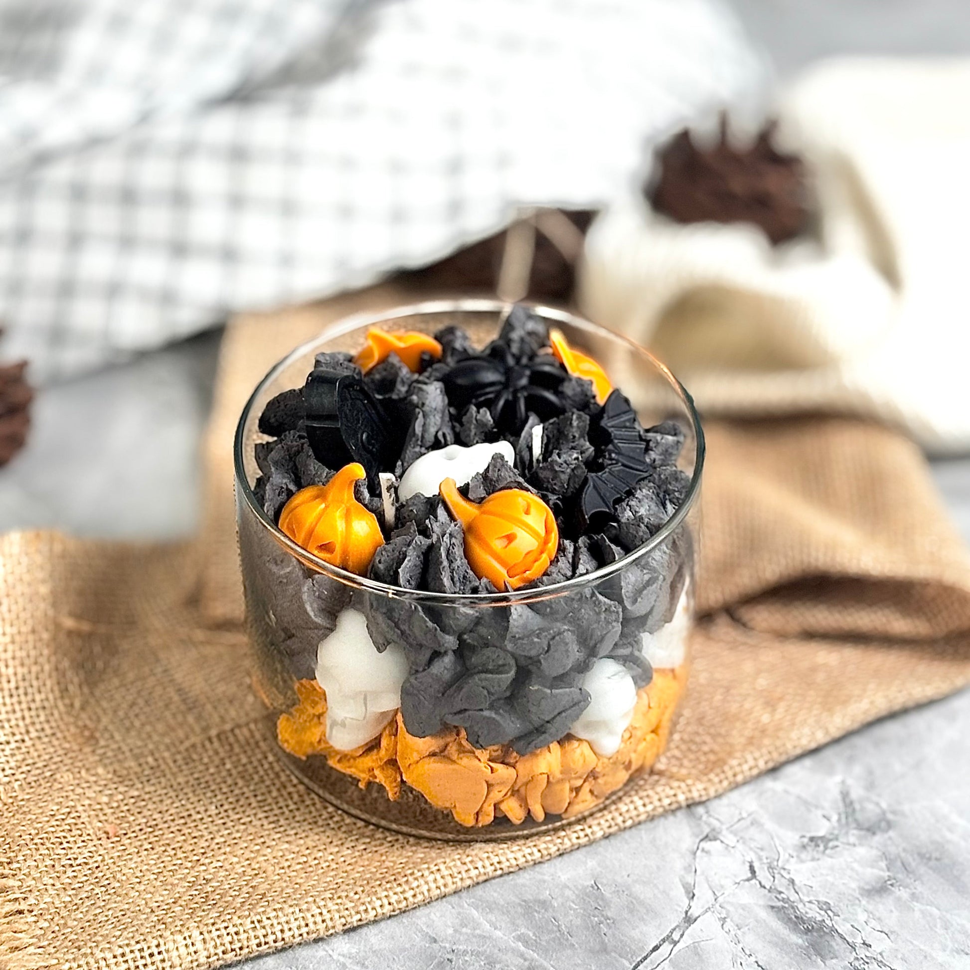 Step into the playful side of spooky season with our Haunted Pumpkin Graveyard Soy Candle. Hand-poured in layers of charcoal grey and orange cream soy wax, this candle is topped with intricate fondant details — skulls, orange mini pumpkins, a tiny grave, and a crawling spider — bringing Halloween magic to life in every detail.
