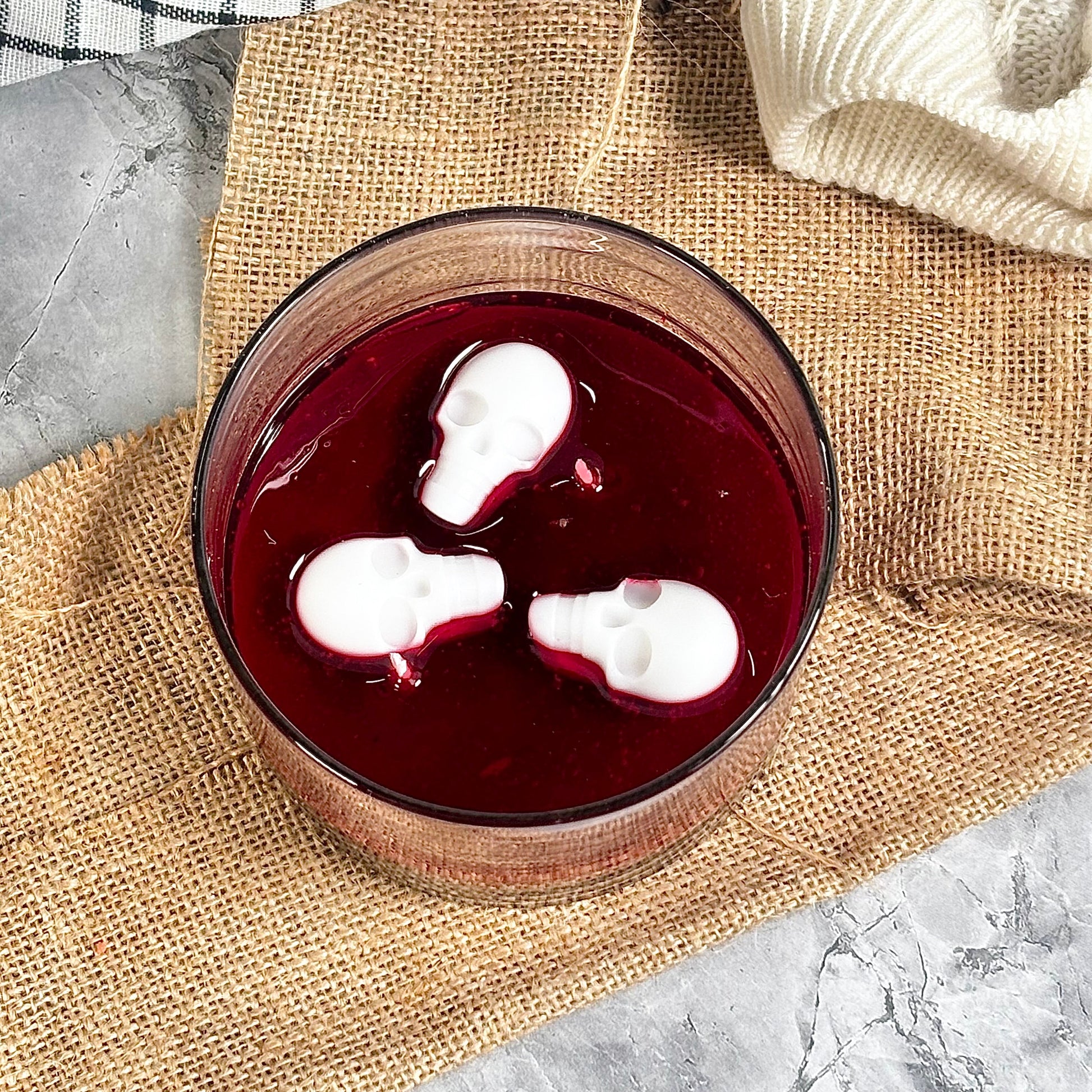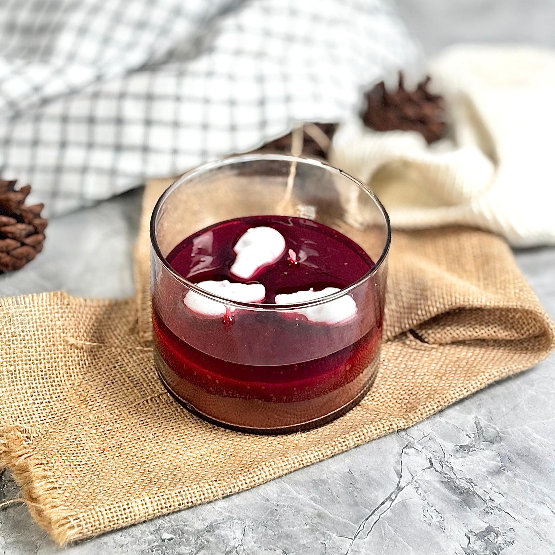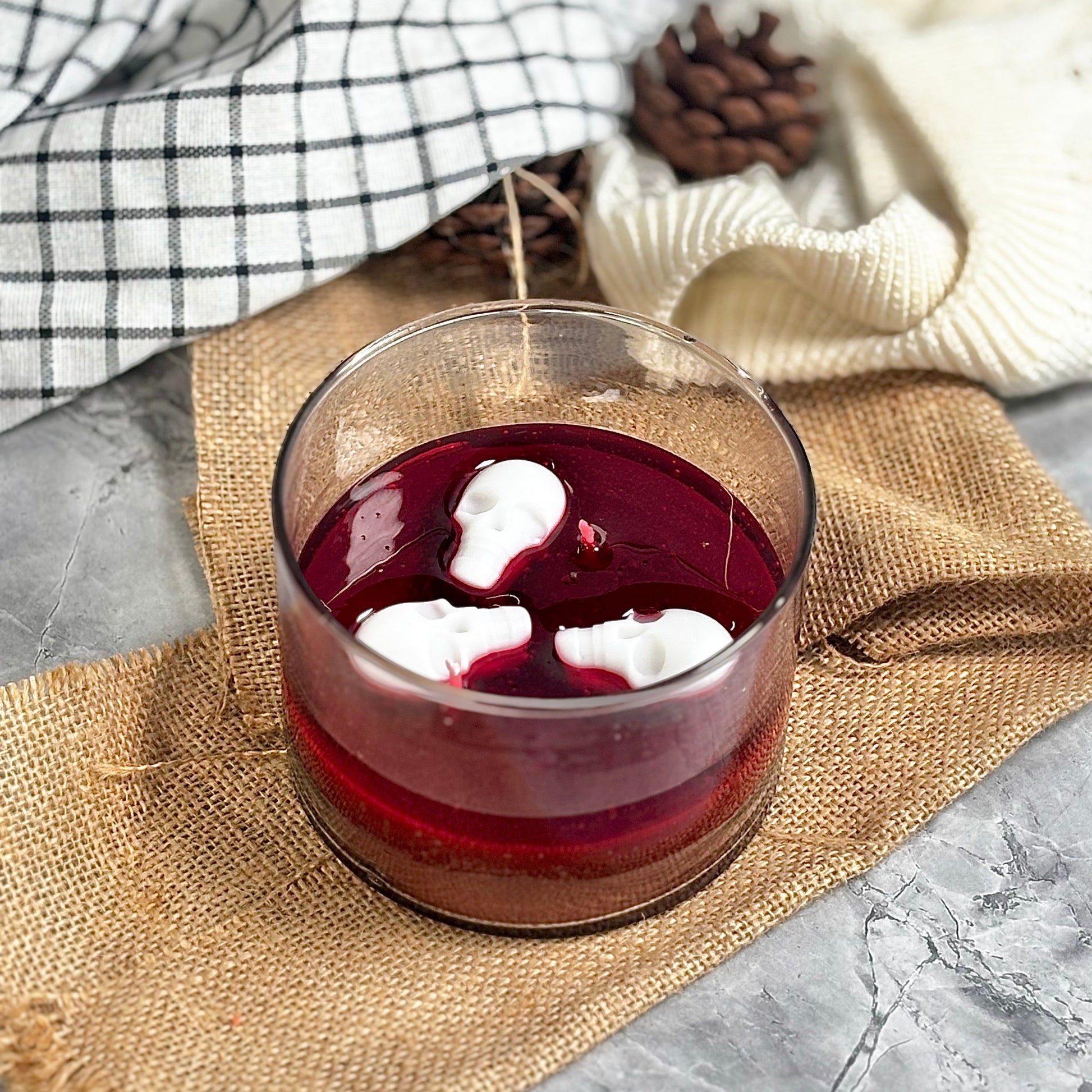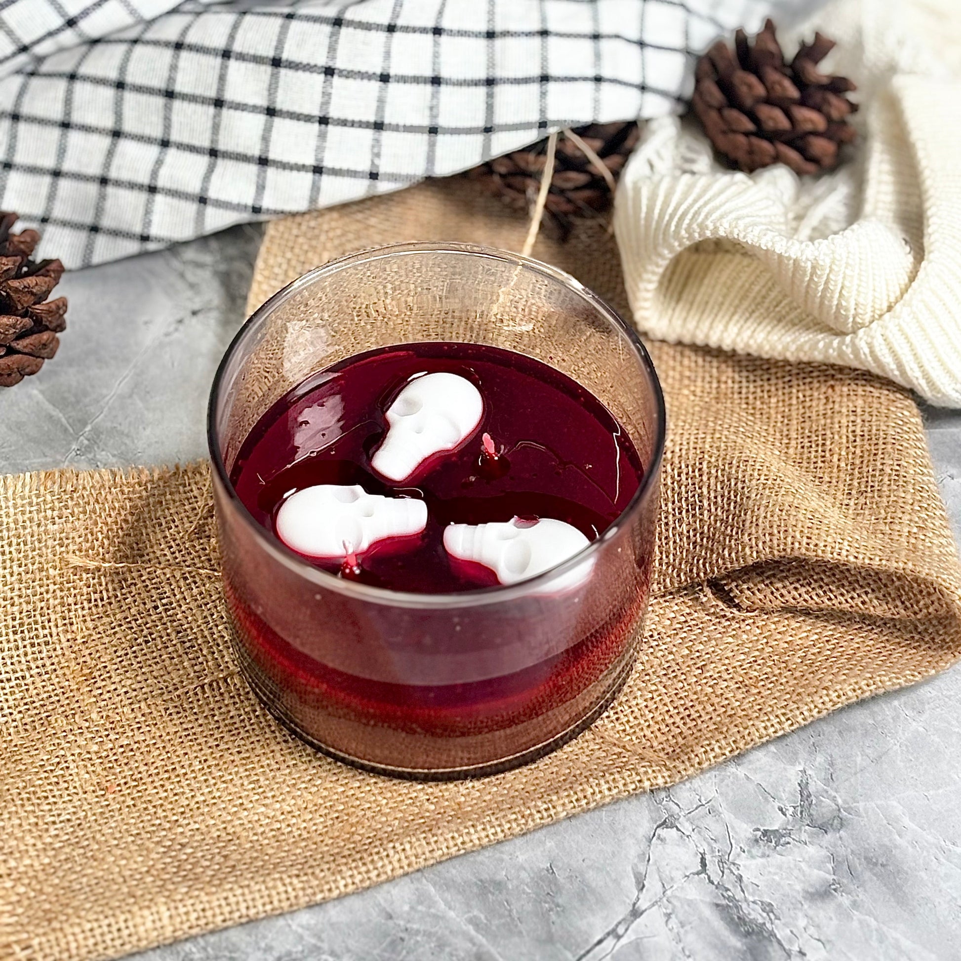 Dramatic and eye-catching, our Blood Moon Skull Candle is a true Halloween showpiece. It features a brown soy wax base, a striking layer of red gel wax that mimics eerie water, and a white skull fondant topper — creating the perfect blend of spooky and stylish décor.