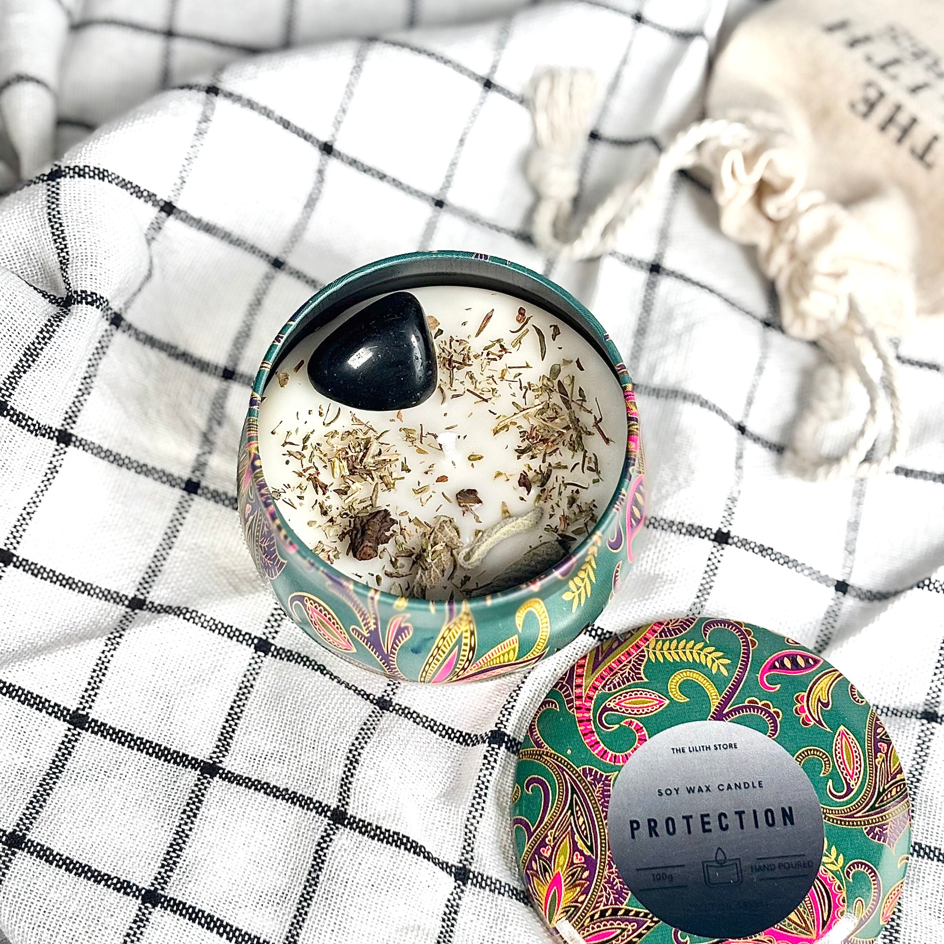 Protection Tin Container Soy Intention Candle by The Lilith Store is a travel-friendly candle designed for mindful rituals and intentional moments wherever you go. Hand-poured with 100% soy wax and mildly scented, this 100 g candle is topped with a Black Obsidian Tumble and infused with Thyme, Sage, and other purifying herbs to create a balanced and grounded atmosphere. Light it with clear intent to center your energy and refresh your surroundings. Compact and reusable, its tin container makes it easy to carry for travel, meditation, or everyday rituals. Remove Crystal from the top before lighting it