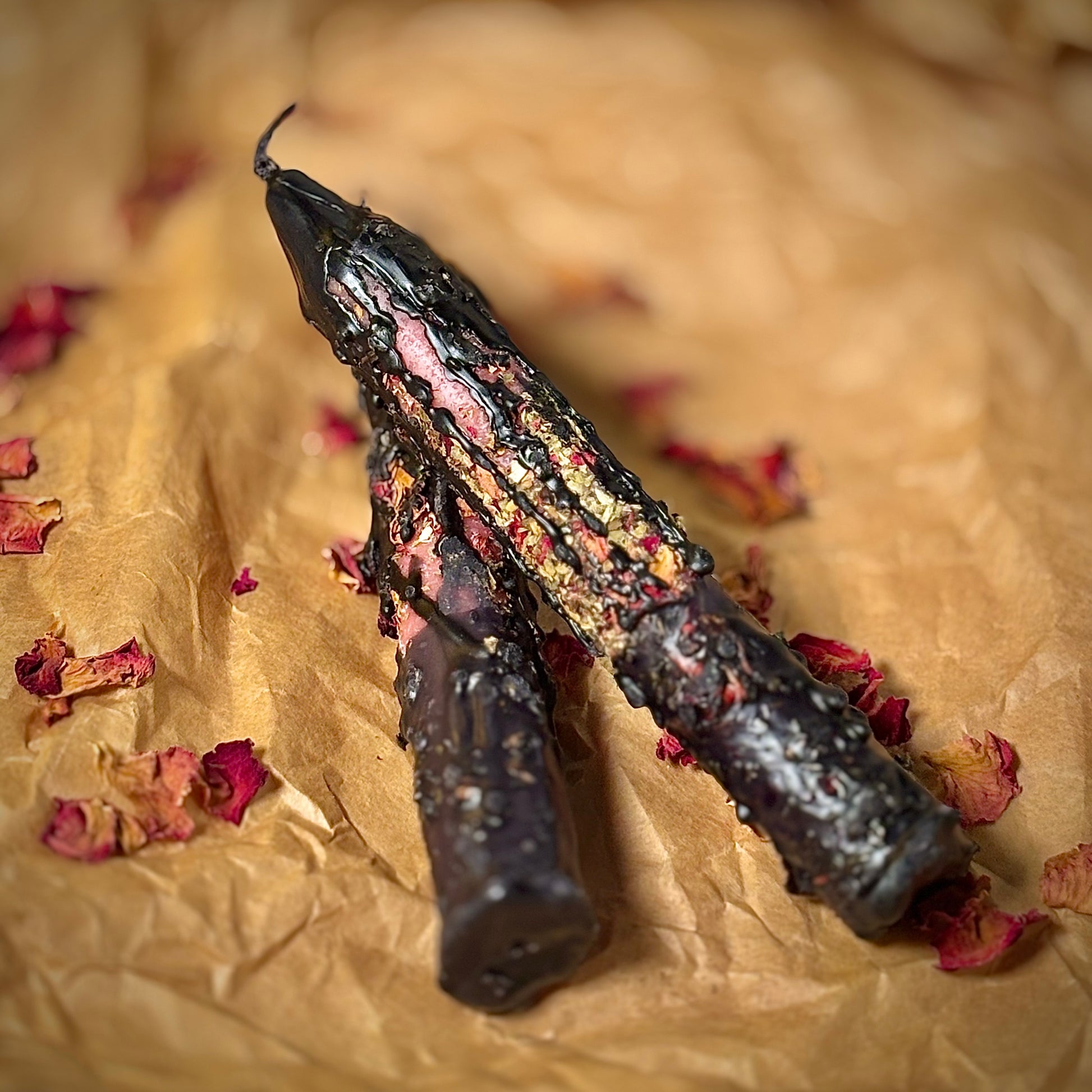This handcrafted black candle is rolled in healing herbs and finished with soft pink accents to support emotional release and heart healing.