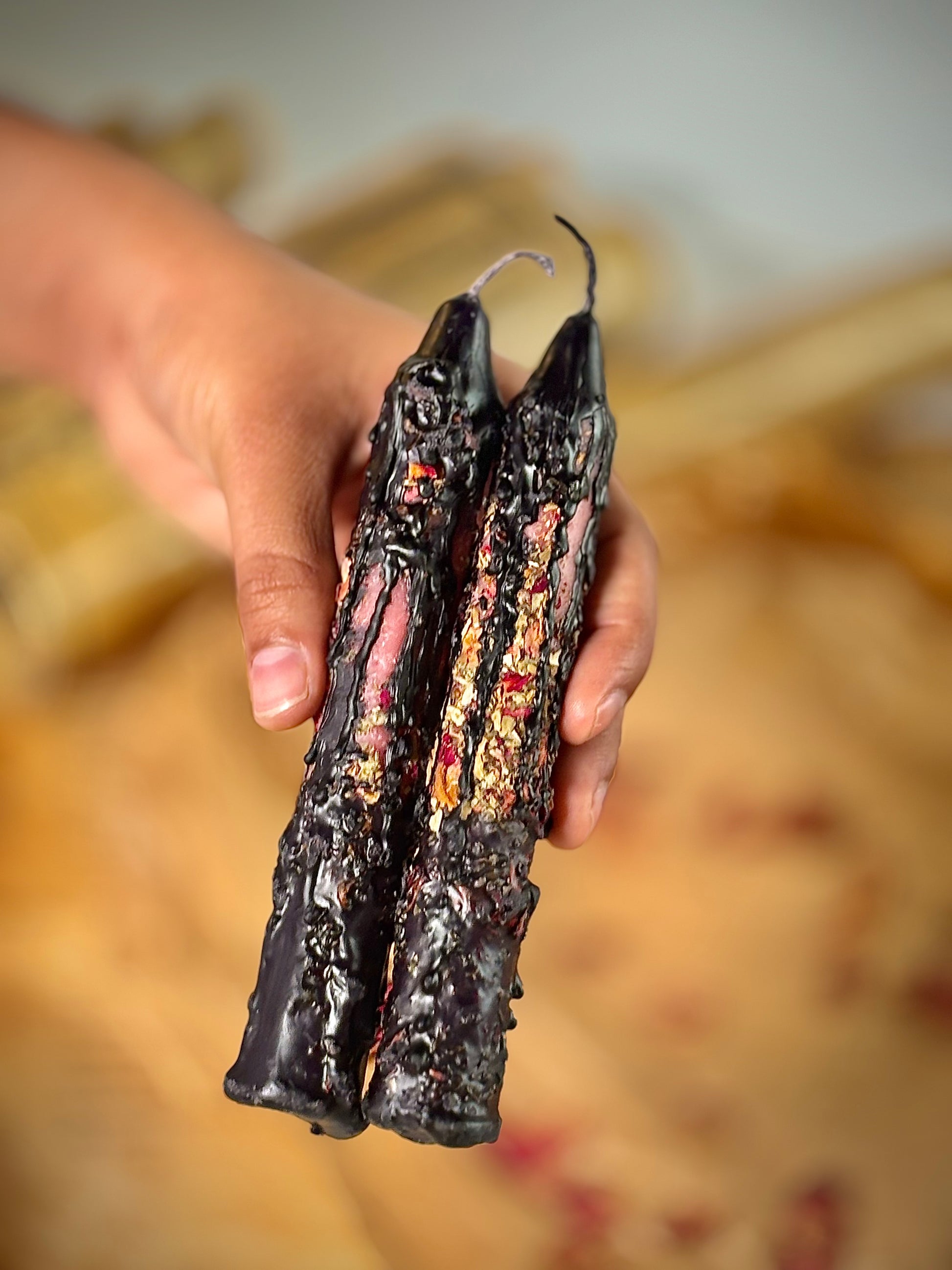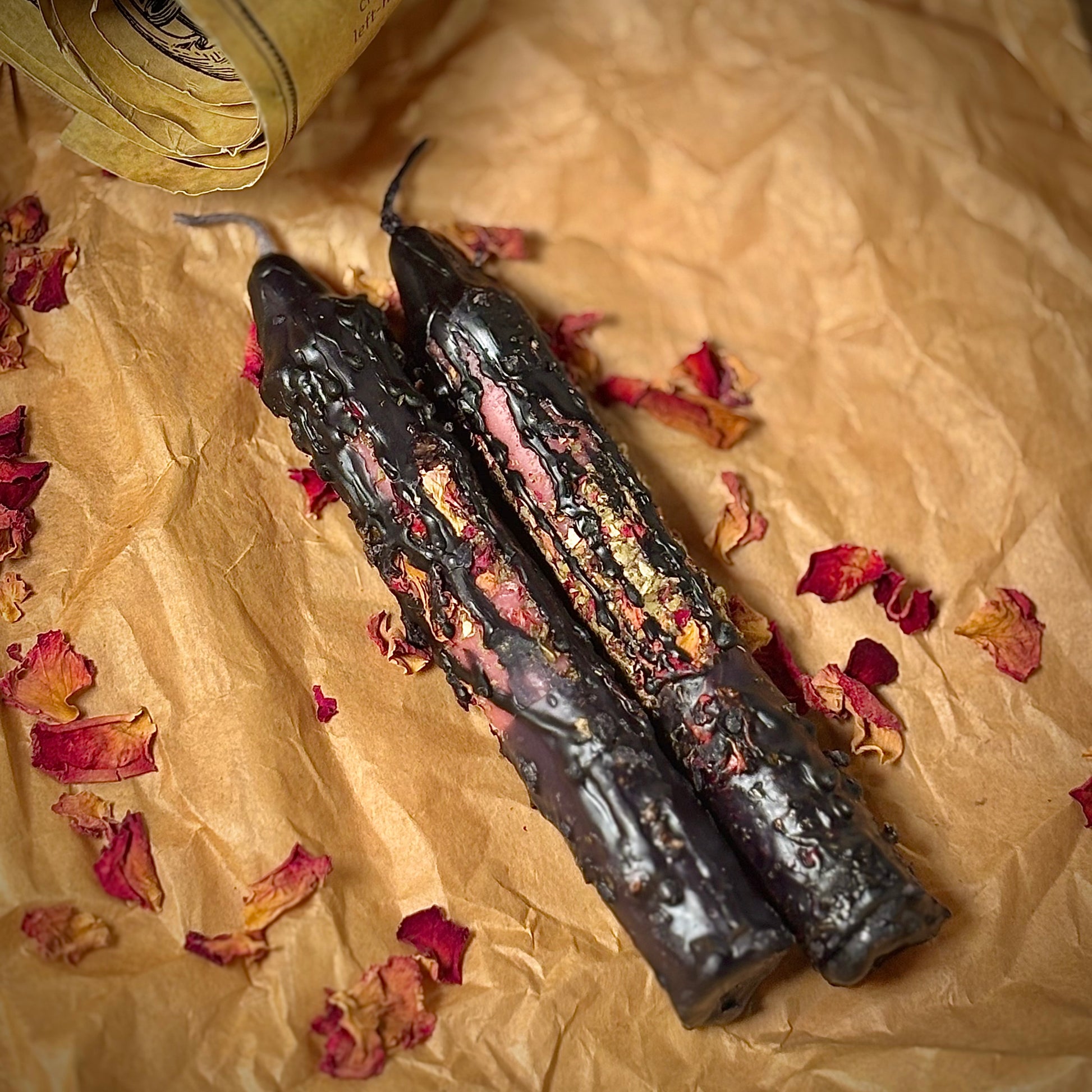 - Black releases what no longer serves, pink calls in healing and love. Dressed in herbs like rose, basil, and mugwort, it’s both powerful and gentle. This candle bridges release and renewal, helping you shed what you’ve carried and embrace who you are becoming. Use during the waning moon or whenever you feel call to.