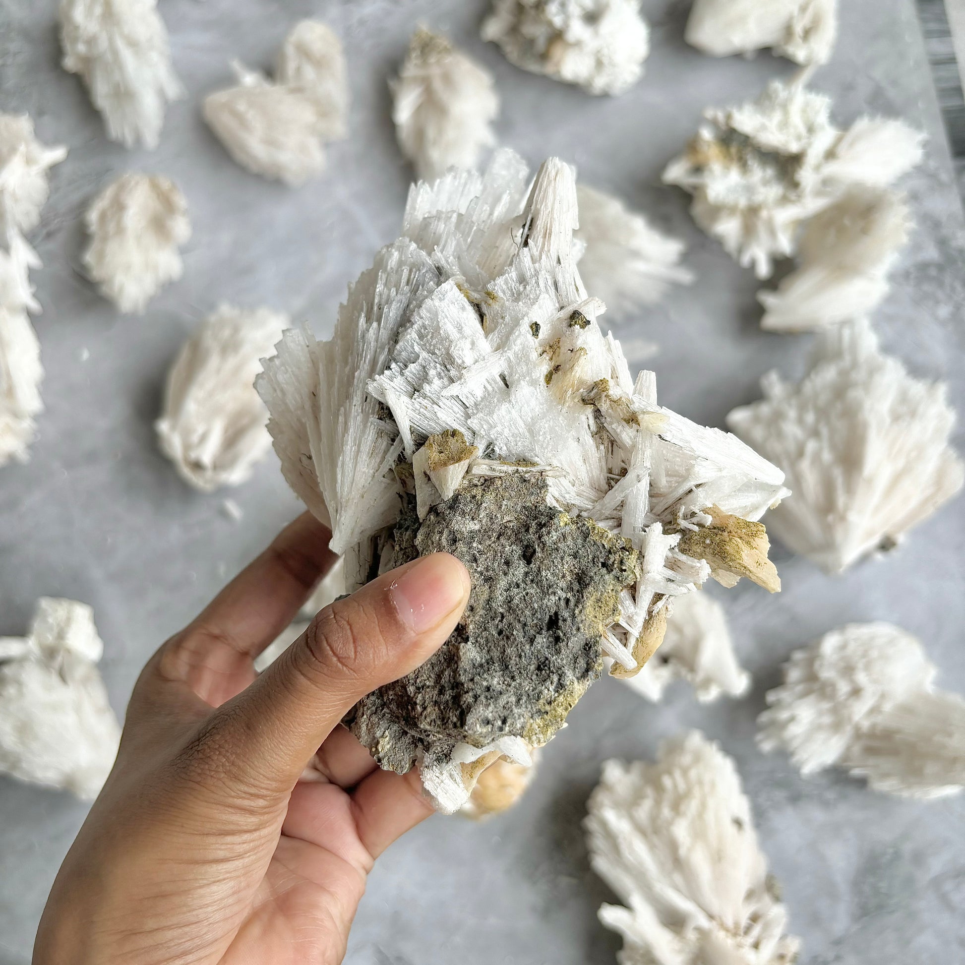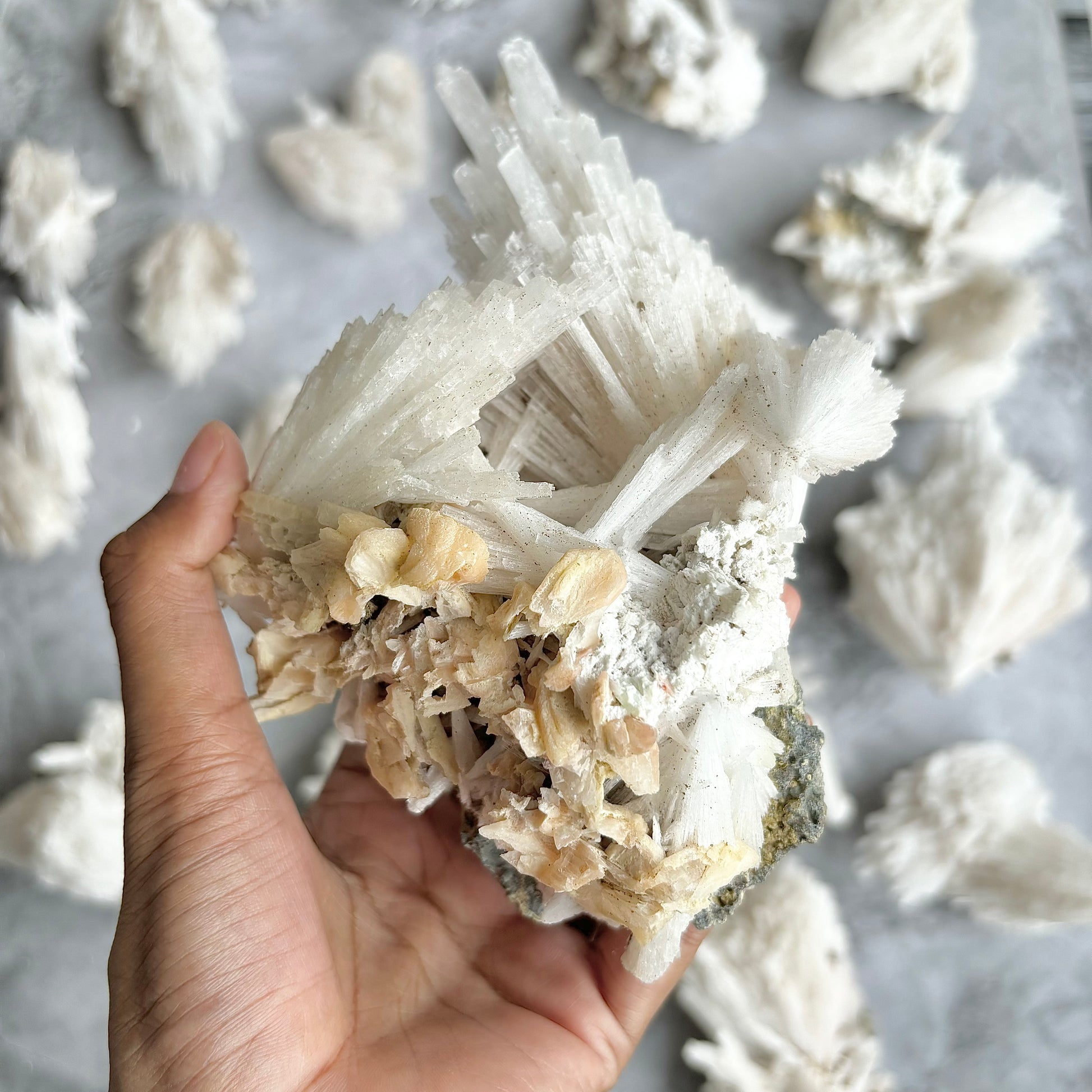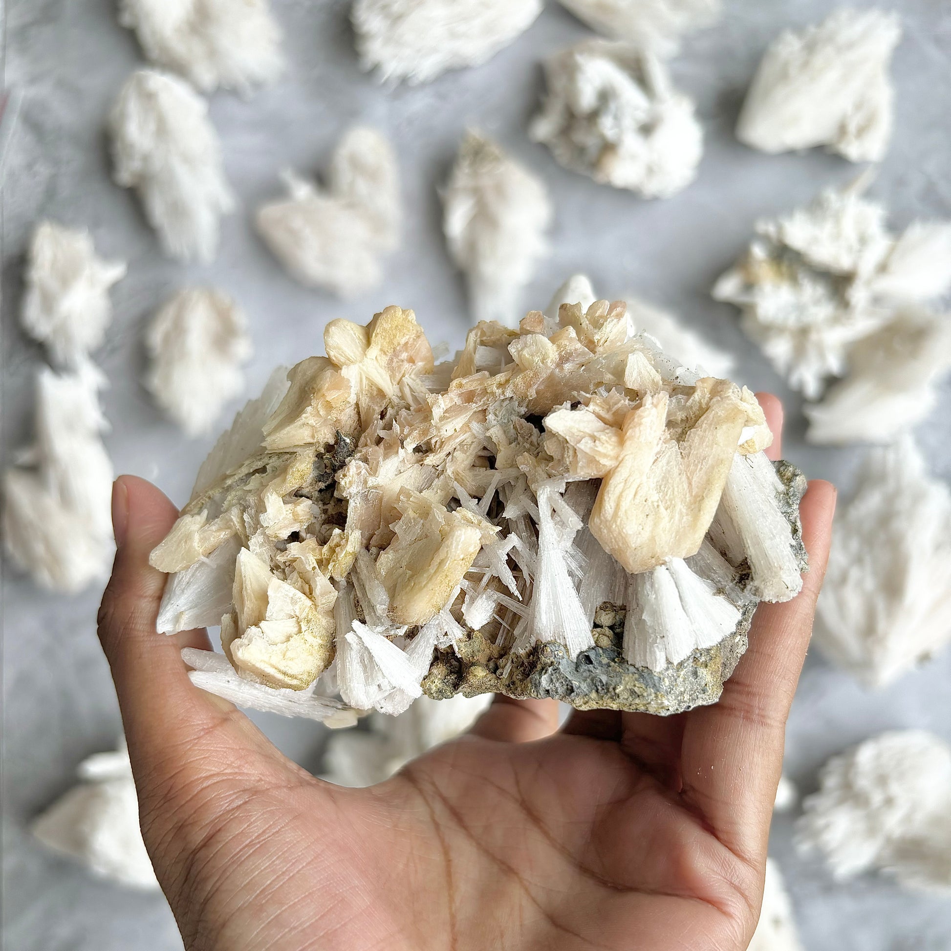 A cluster of scolecite and stilbite offers a harmonious blend of metaphysical benefits, promoting both inner peace and spiritual growth. Scolecite's calming energies aid in achieving deep relaxation and enhanced communication, particularly on a spiritual level, while stilbite radiates love and compassion, fostering kindness and empathy. This combination is ideal for meditation, facilitating intuitive and spiritual development, and providing clarity and focus. Together, they create a supportive environment for emotional and mental well-being, making them a powerful duo for anyone seeking to enhance their spiritual journey and maintain a balanced, tranquil state.