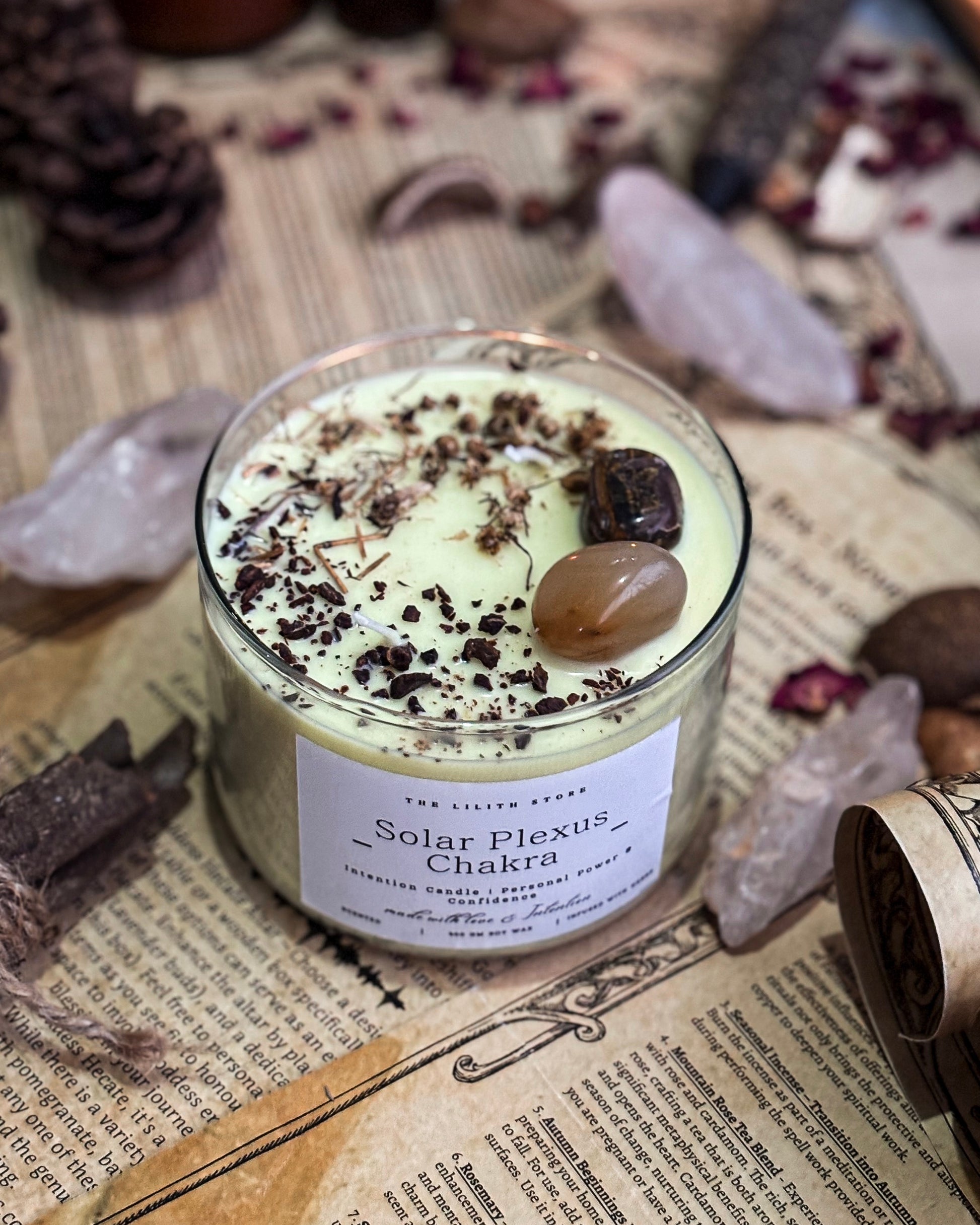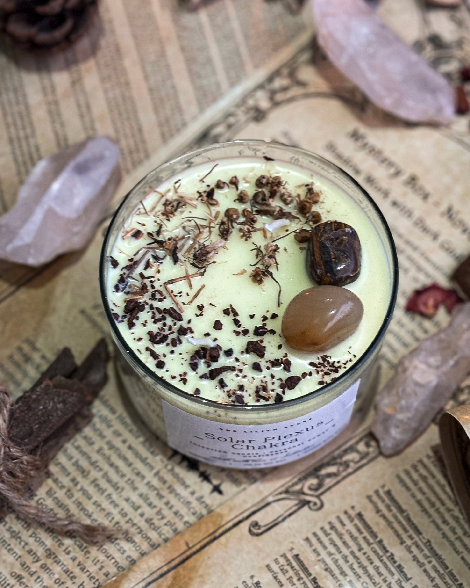 Ignite your personal power, boost confidence, and enhance willpower with our Solar Plexus Chakra Intention Candle. This vibrant yellow candle, crafted with 400 gm of natural soy wax, is infused with empowering herbs like calendula, cinnamon, chamomile, High John, and dandelion root, alongside the energizing properties of yellow aventurine and tiger's eye crystals.