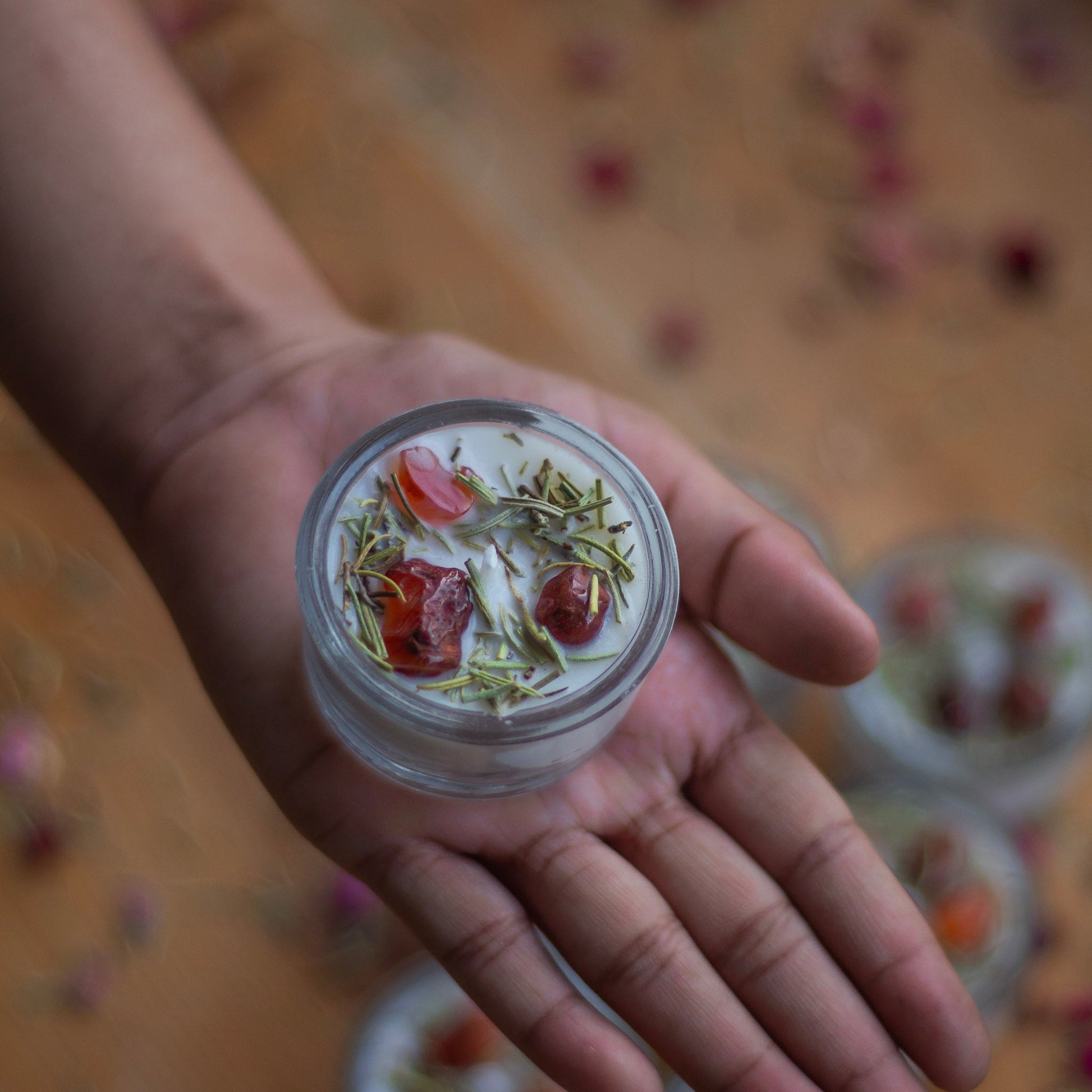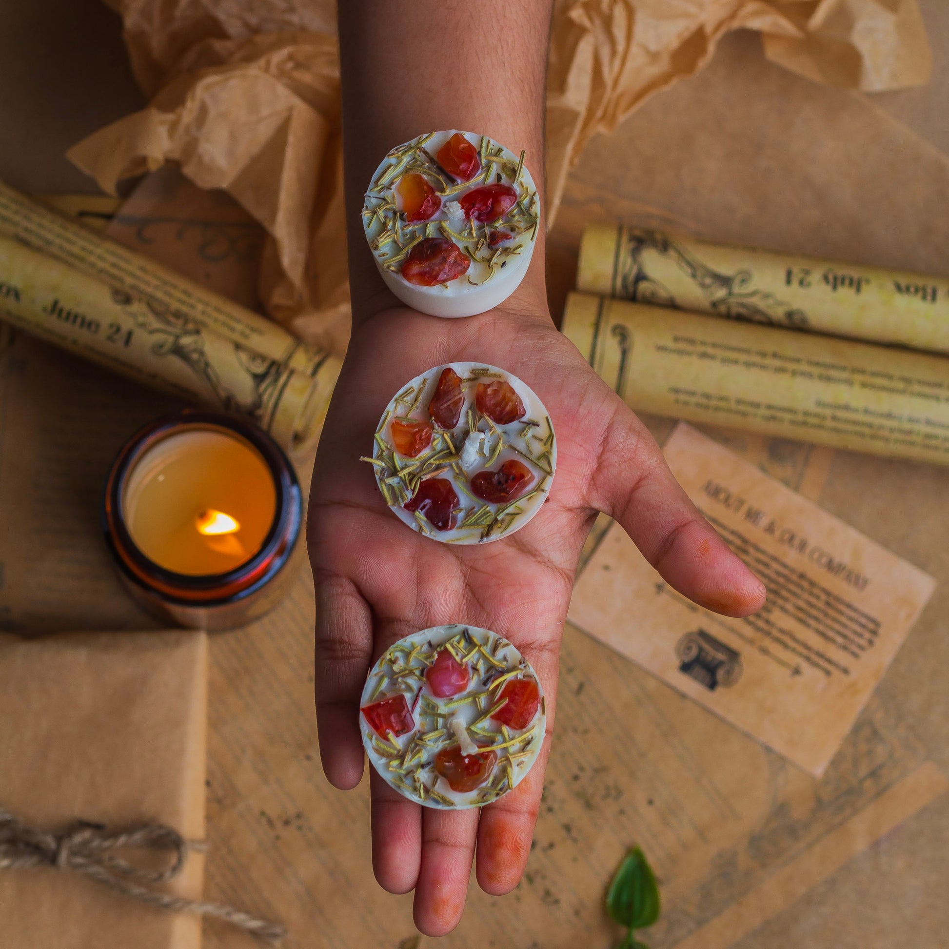 I love these tea lights. The aroma is gorgeous and it burns for hours. And since there are no synthetic scents, I know that I'm not breathing in anything nasty. And she's generous with the crystals and herbs too. I now have a small bowl filling up fast with these crystal chips.