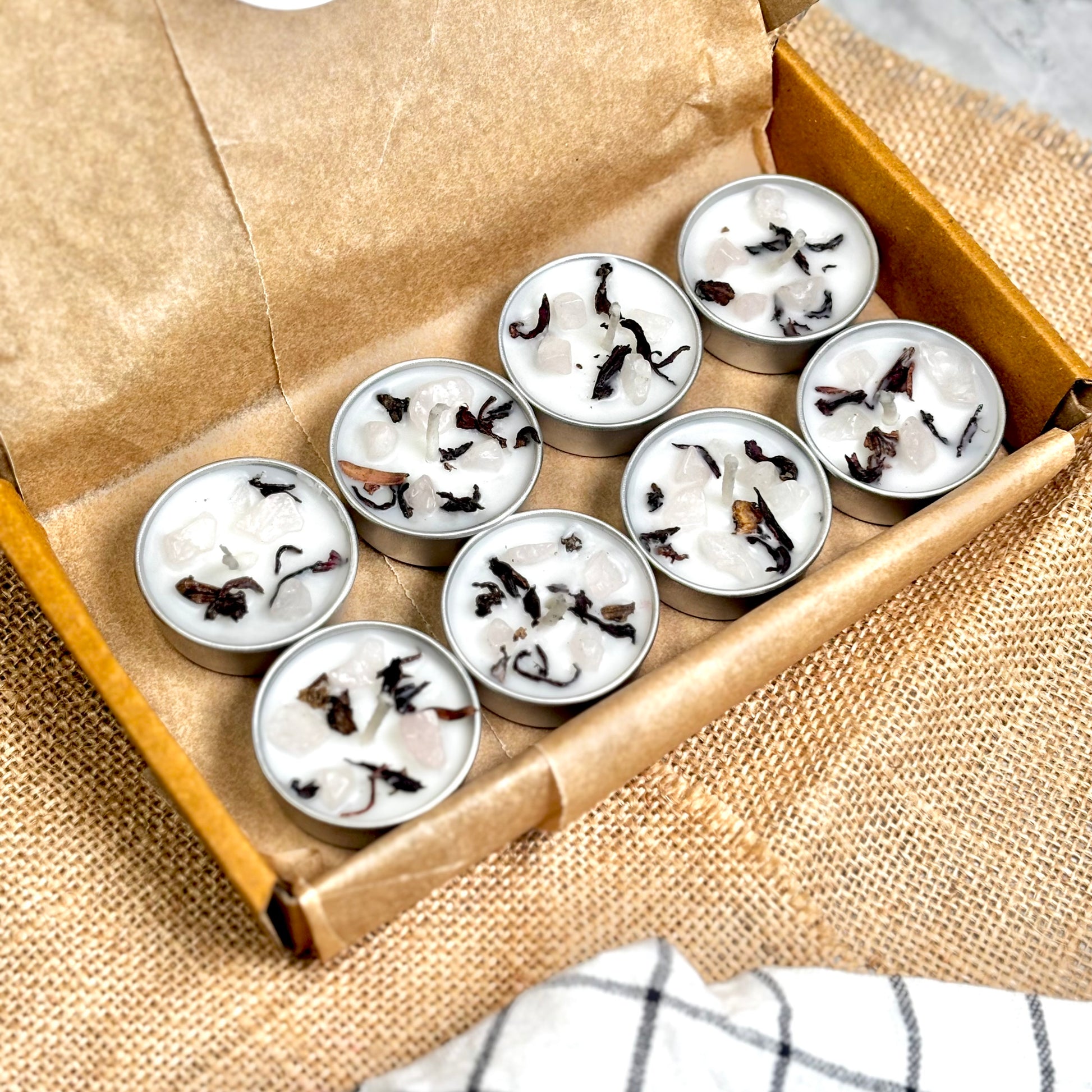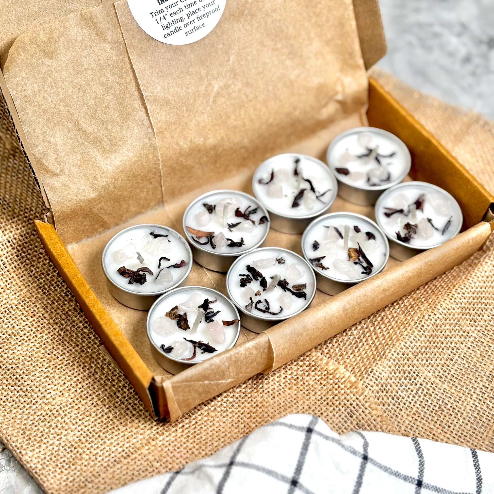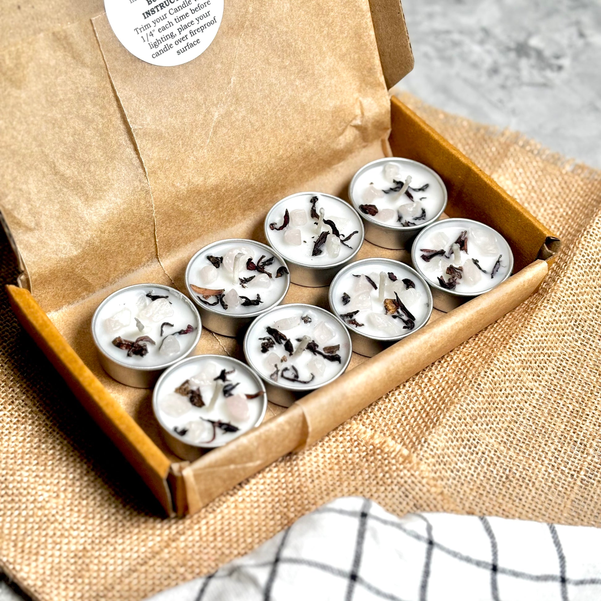 (hibiscus tealight candle, rose quartz tealight, soy wax tealight, unscented crystal candle, The Lilith Store)