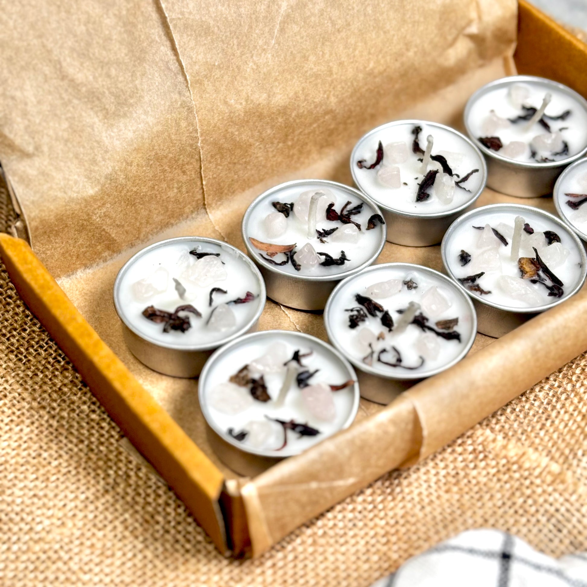 Hibiscus & Rose Quartz Soy Tealight Candle by The Lilith Store is a beautifully crafted unscented soy wax tealight designed to bring a soft and mindful glow to any space. Each 12 g candle is hand-poured and topped with Hibiscus petals and Rose Quartz crystal chips, adding a touch of natural elegance and charm. Ideal for meditation corners, altar setups, or home décor, these tealights offer a clean, smoke-free burn and a calming presence without added fragrance.