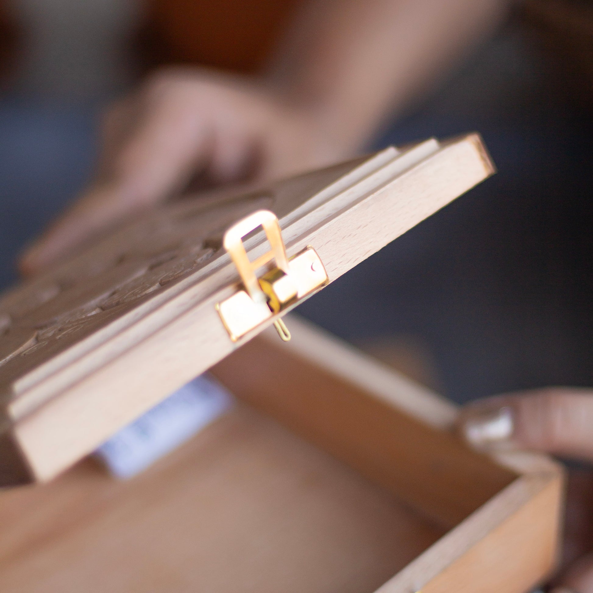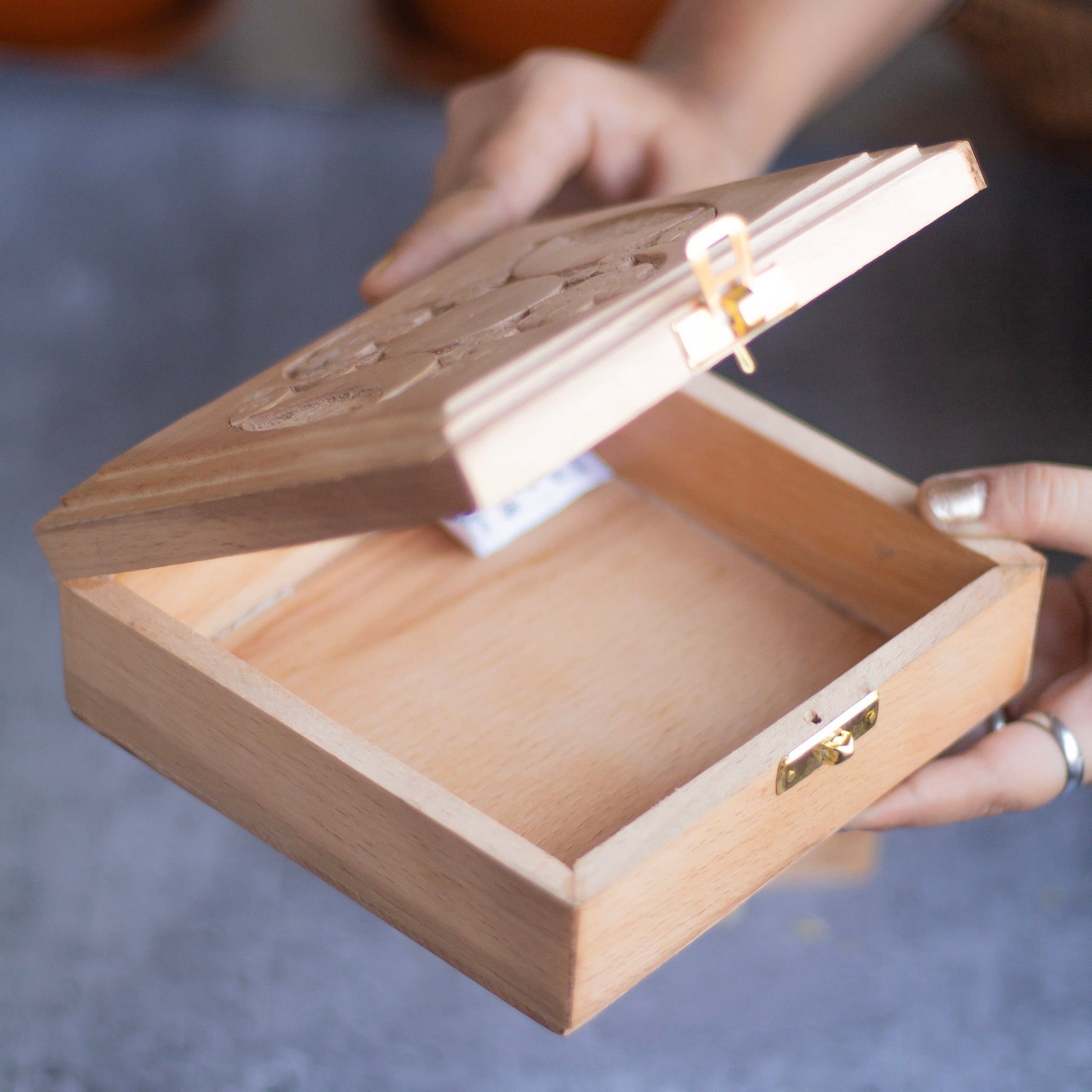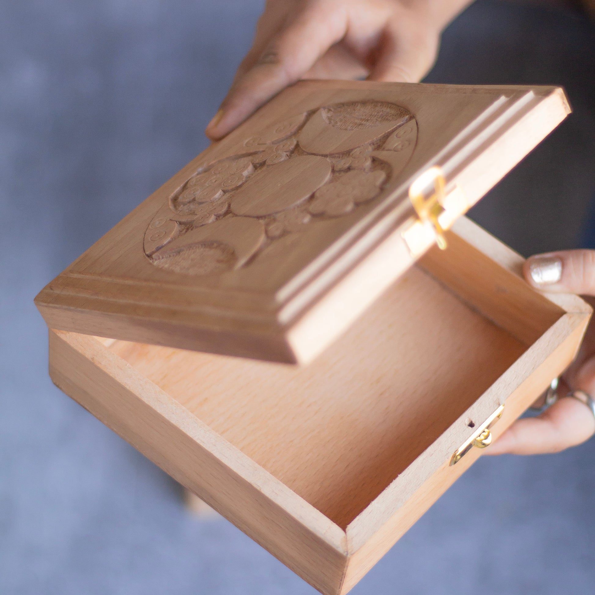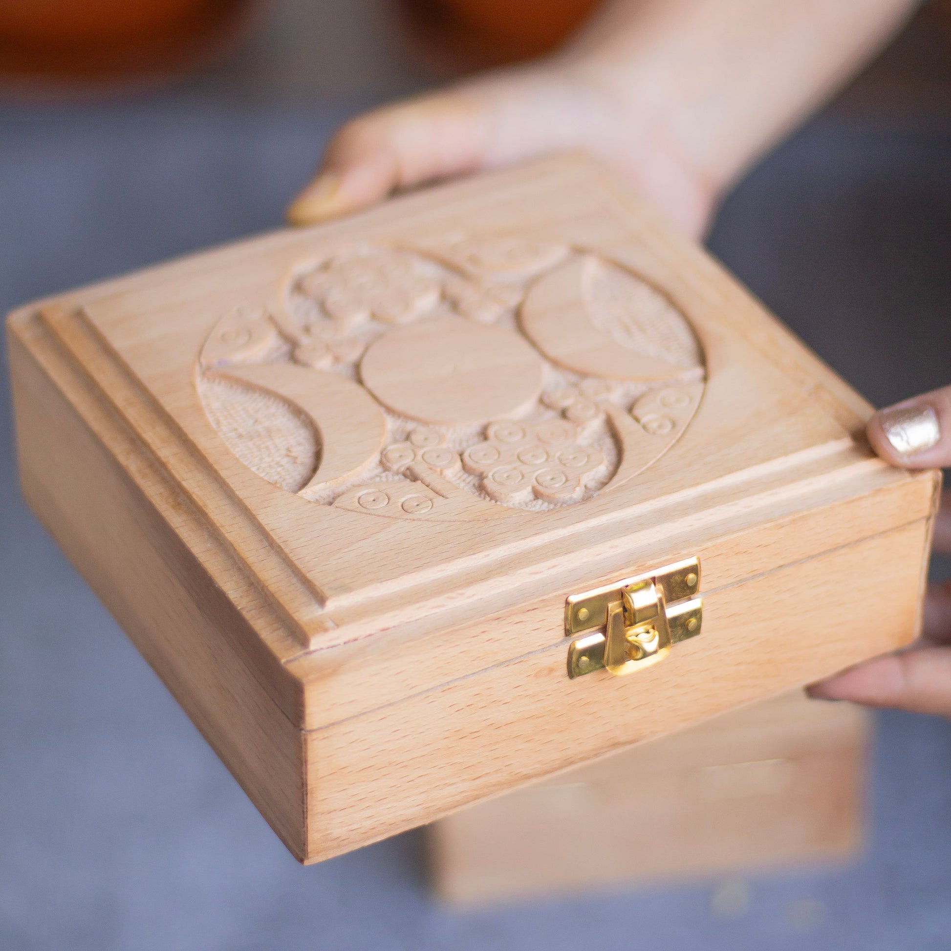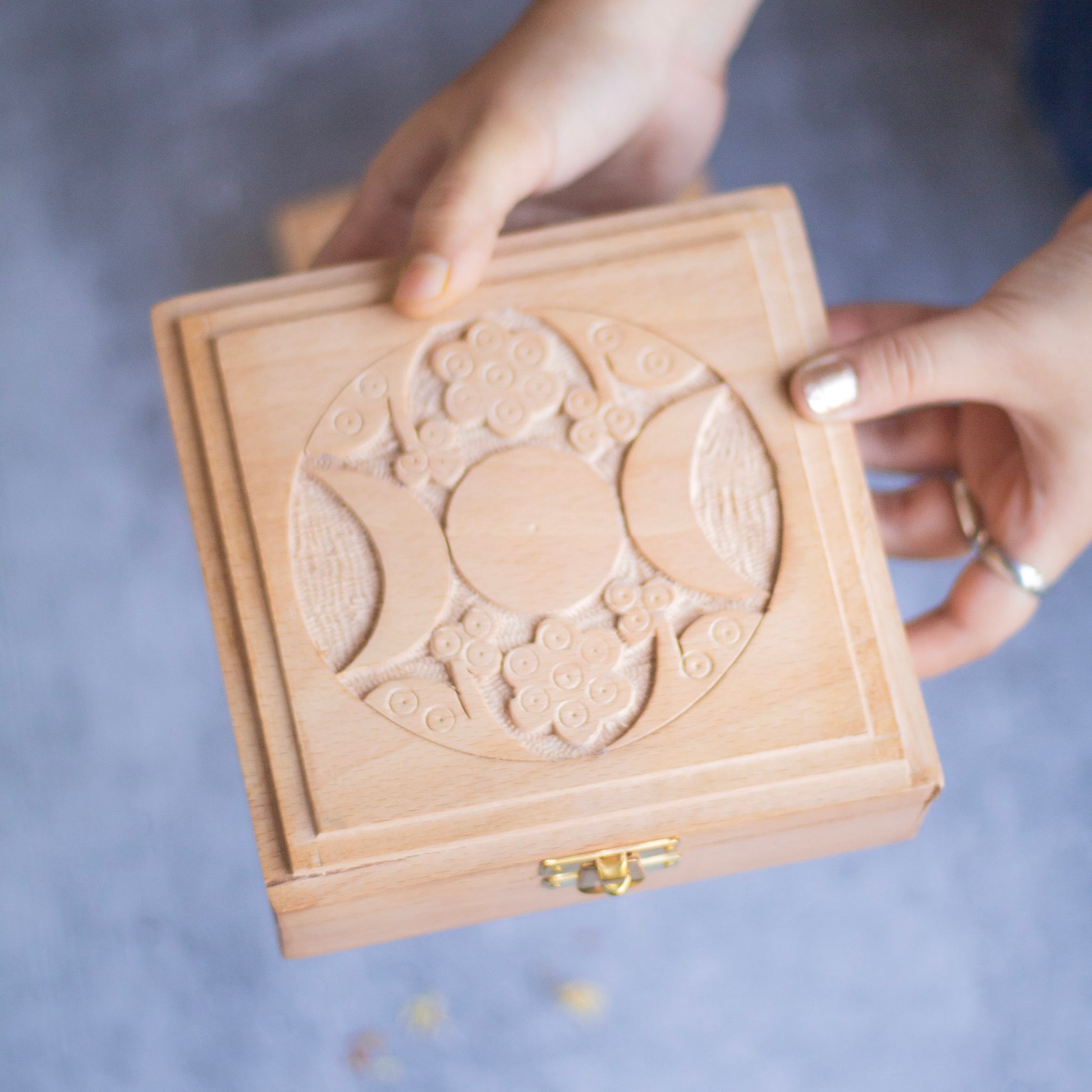 This triple moon phase carved wooden box is made from durable steam beech wood and measures 6 x 6 inches. Its intricate design adds a touch of elegance to any room, while providing a secure storage space for your precious belongings. Keep your items safe and organized in style with this unique handcrafted box.